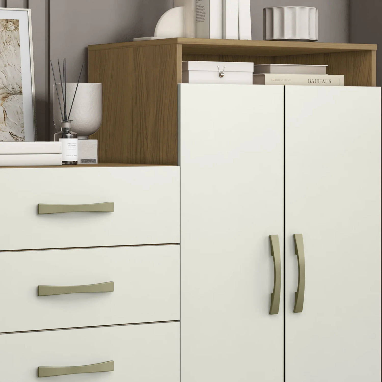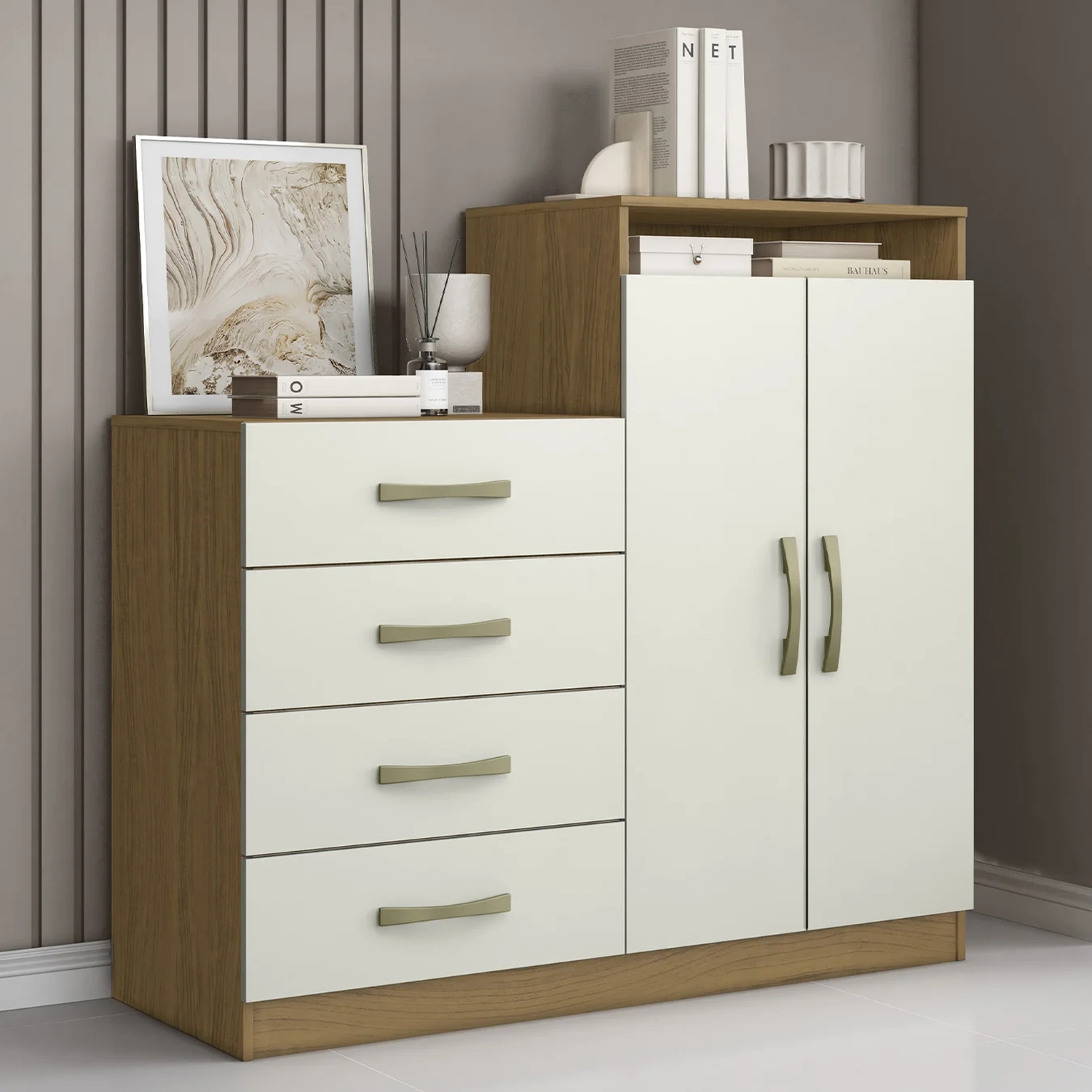 Essa Cômoda Para Quarto conta com quatro gavetas e duas portas com dobradiças metálicas, suas duas prateleiras internas ajudam a manter tudo no lugar com praticidade e funcionalidade.