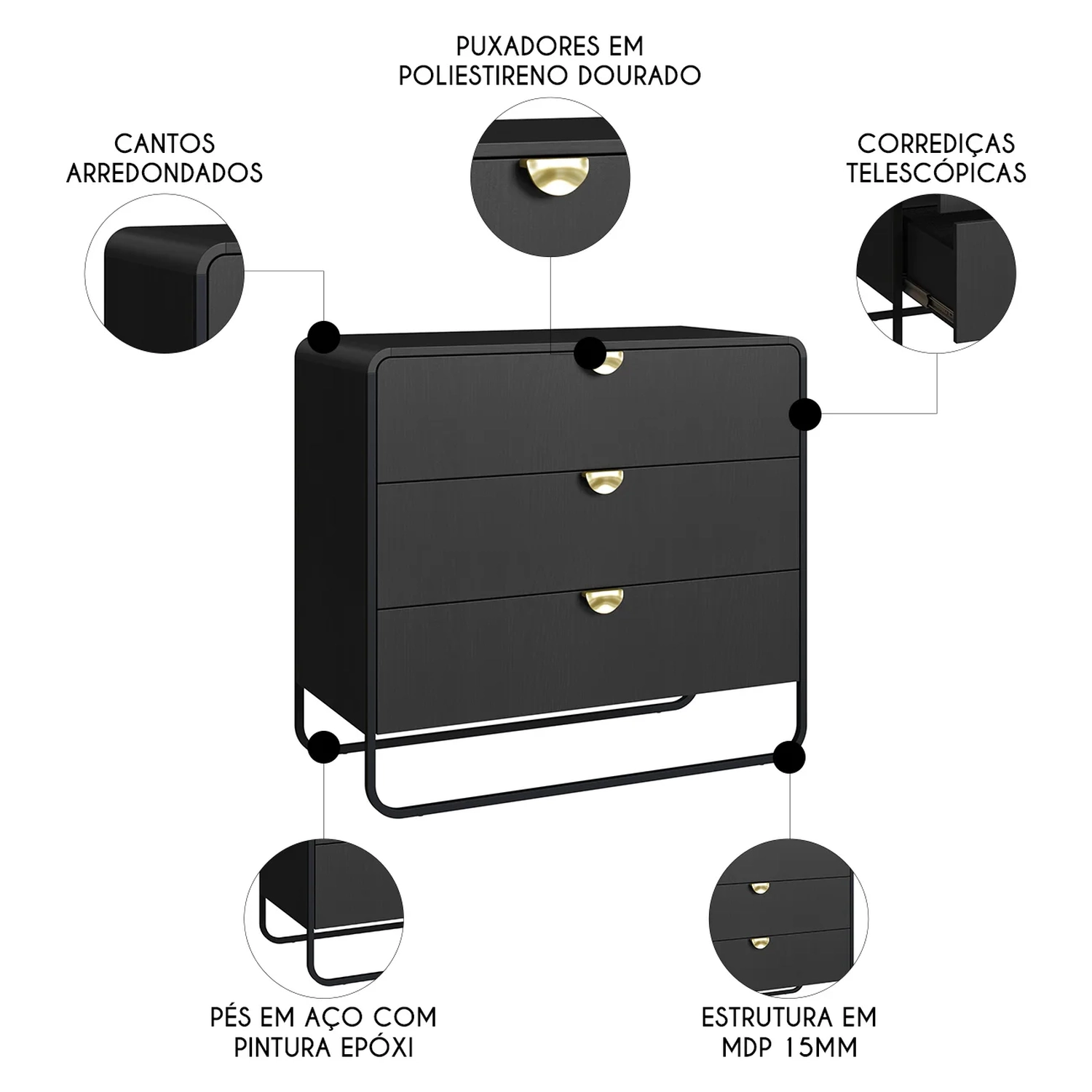 Com três gavetas espaçosas, dá pra guardar roupas, acessórios e o que mais você quiser, tudo sempre à mão. As corrediças telescópicas facilitam a abertura e garantem aquele deslizamento leve.