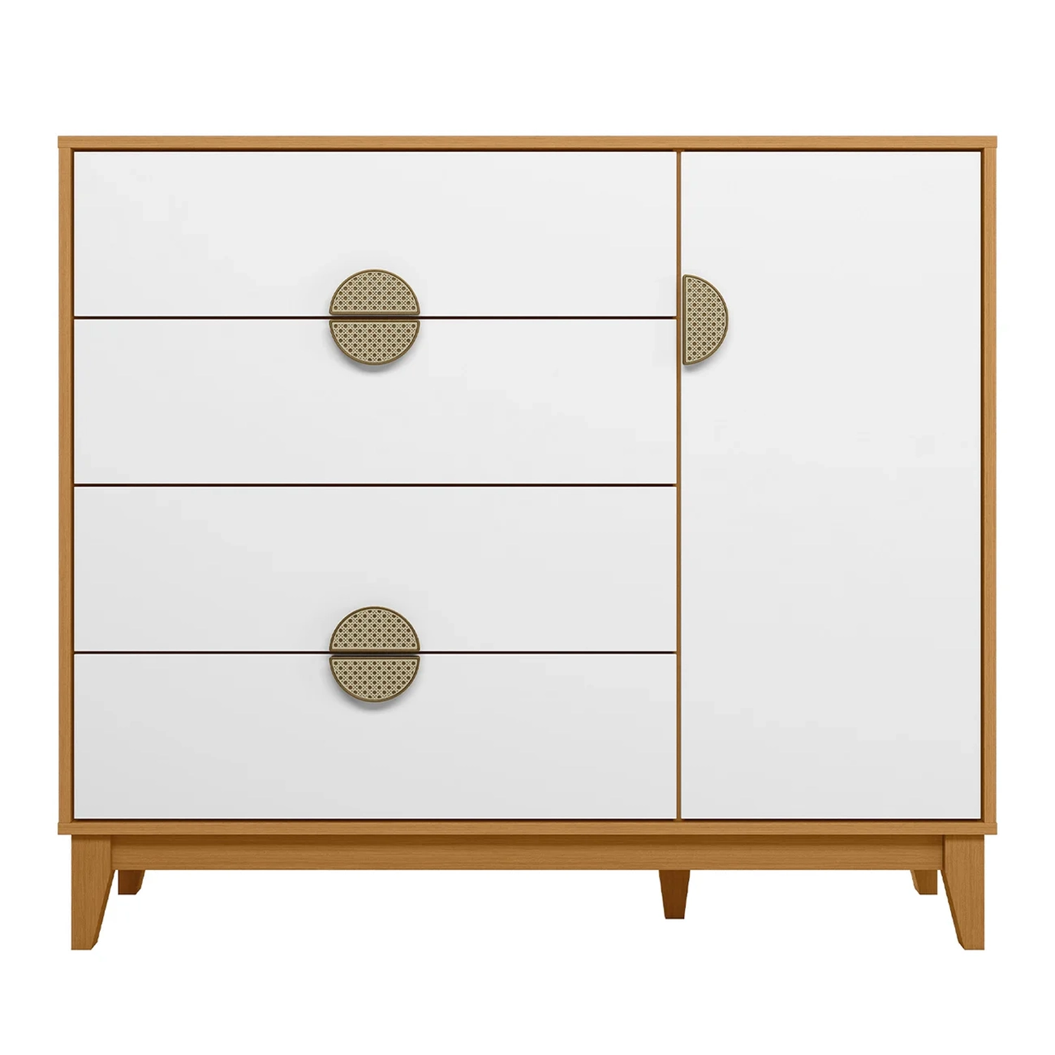 Com seu design clássico, essa Cômoda 4 Gavetas é perfeita para organizar suas roupas e acessórios. As gavetas tem corrediças telescópicas, você terá espaço extra para guardar seus itens menores de forma prática e organizada, enquanto no compartimento interno com duas prateleiras é possível organizar diversos outros itens, como calçados e bolsas. Já o charme fica por conta dos puxadores em ABS com acabamento metalizado dourado e aplicação que lembra palha, que conferem um toque de sofisticação, criando uma Cômoda Estilo Retrô. Para completar, a porta possui dobradiças com fechamento suave, que evita bater ao fechar, enquanto os pés de madeira garantem um suporte firme e são uma adição elegante ao design dessa cômoda com porta. Um móvel versátil e funcional, perfeito para manter seu quarto organizado sem comprometer o estilo.