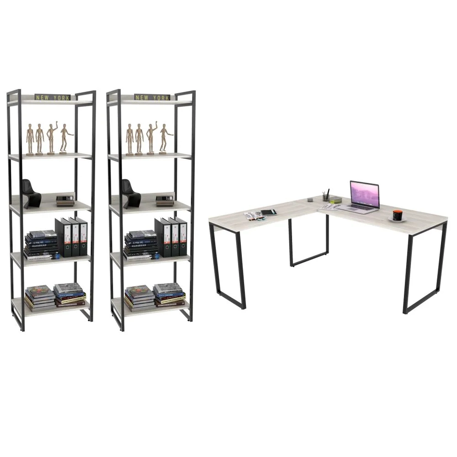 Conjunto Escritório Estilo Industrial Mesa 150x150cm e 2 Estantes 60cm 5 Prateleiras Prisma Snow - Mpozenato, são ideais para valorizar sua decoração garantindo praticidade e estilo. Confeccionadas em MDP de 15 mm com acabamento em BP e partes metálicas em pintura epóxi que proporcionam maior durabilidade e resistência aos produtos. Além disso, contam com design inovador com seu estilo industrial combinando os tubos de aço à madeira, trazendo um pouco do charme urbano ao seu ambiente. Ideal para expor objetos decorativos como livros. Adquira já!