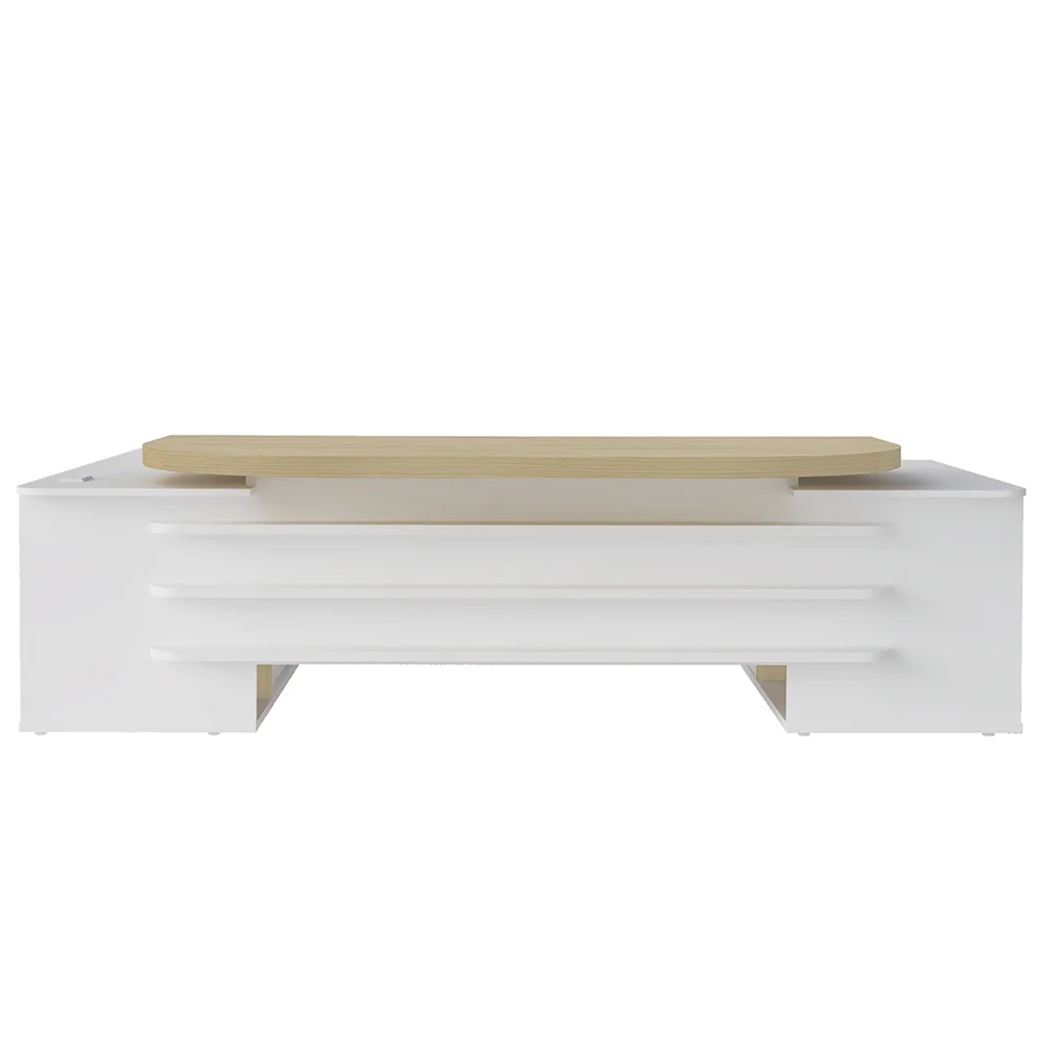 - Mesa ampla com design em U, com espaço para armazenamento.