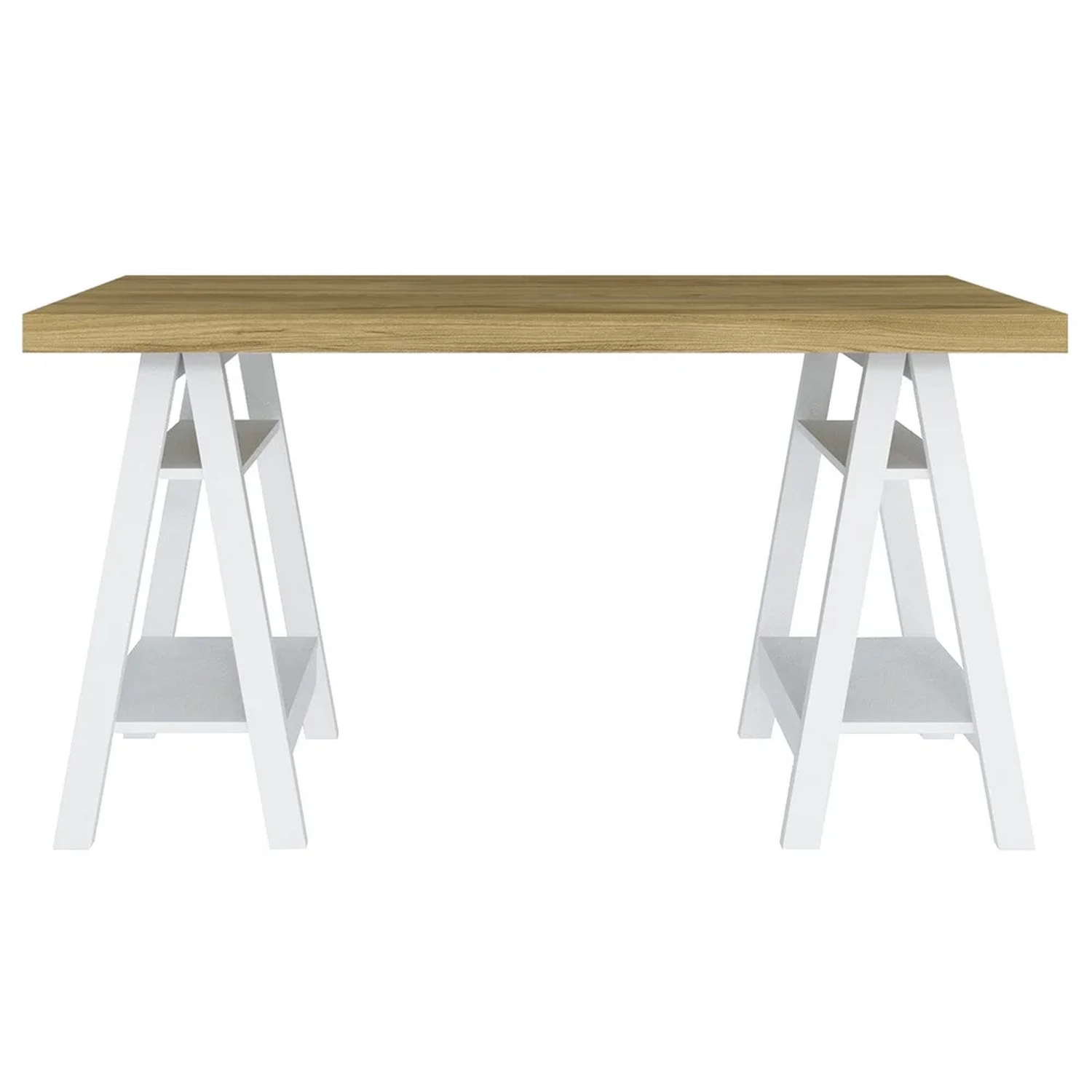 - Mesa com pés cavalete em MDP 25mm e duas prateleiras em MDP 15mm.
