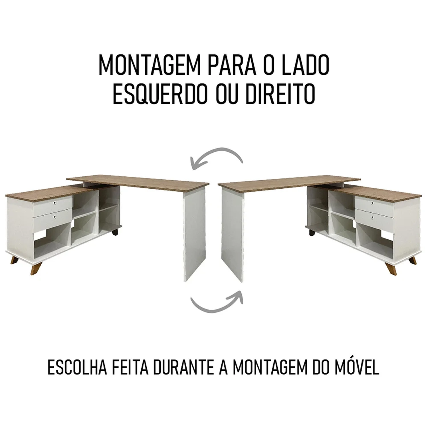 Além do design moderno e tonalidades sóbrias que harmonizam facilmente com qualquer ambiente e ainda dá aquele toque na decoração, essa mesa home office também é sinônima de versatilidade. Primeiro, por ser uma mesa em L que tanto leva otimização na circulação do cômodo, como proporciona uma ampla área de trabalho; segundo porque possui montagem flex, ou seja, você optar o lado que melhor se adequa ao seu ambiente; terceiro, possui traseira revestida, o que permite você aproveita-la em qualquer posição, inclusive como divisor de ambientes.