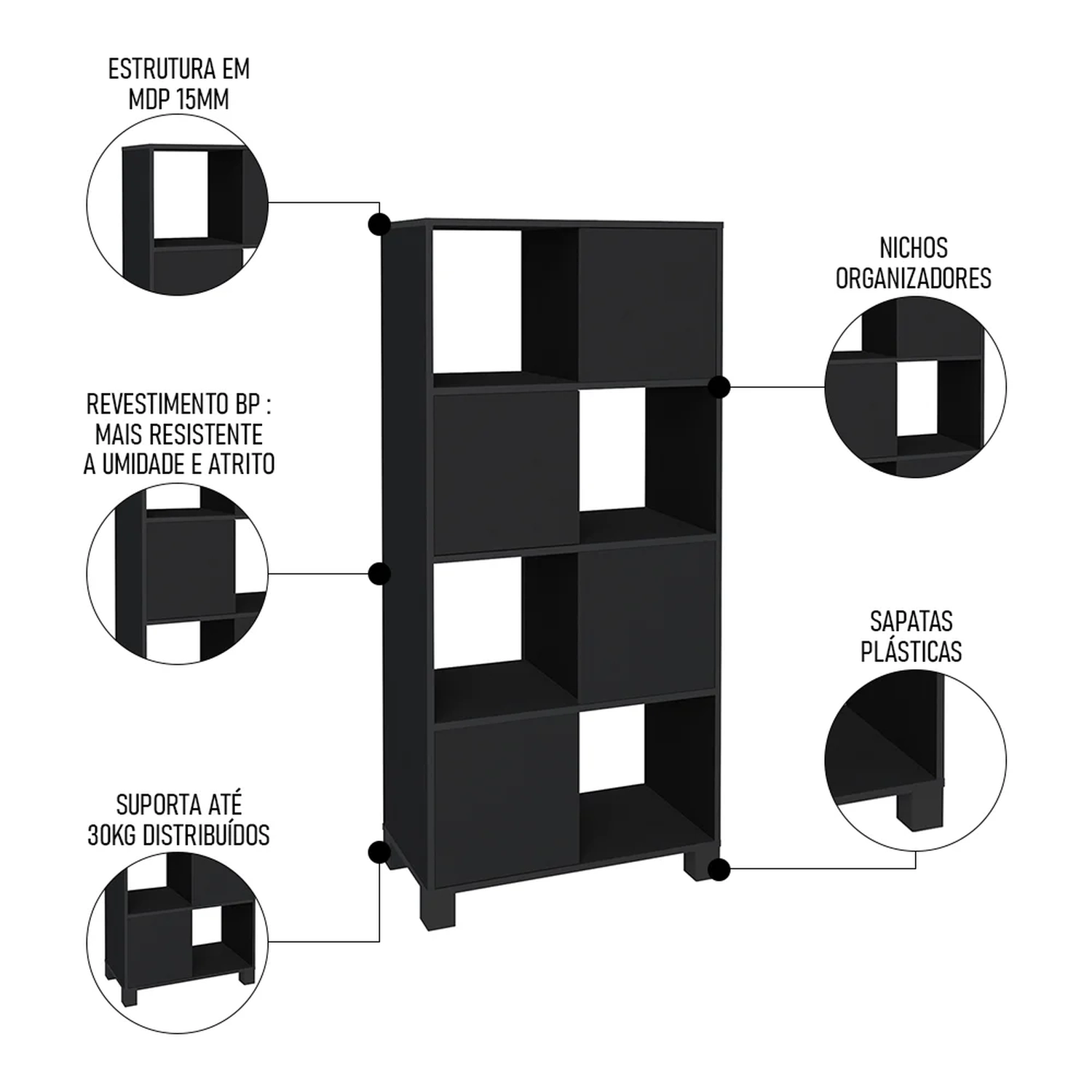 Peso Suportado: 20 kg na Mesa, 10 kg no Estante, 10 kg no Balcão, 8 kg no Gaveteiro.