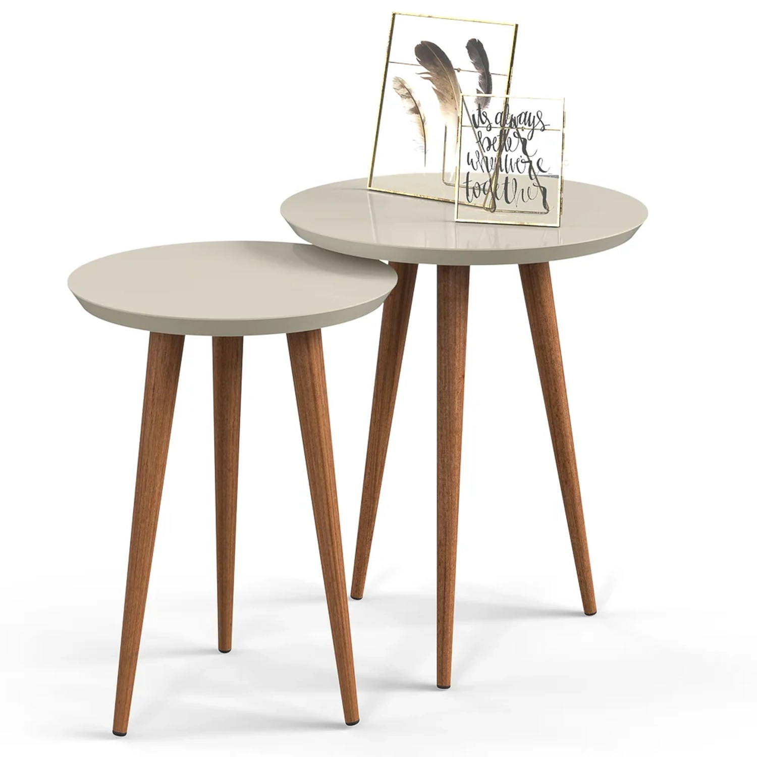Conjunto Mesas Laterais Redondas Pés Madeira Luna Off White - Patrimar 660044255
