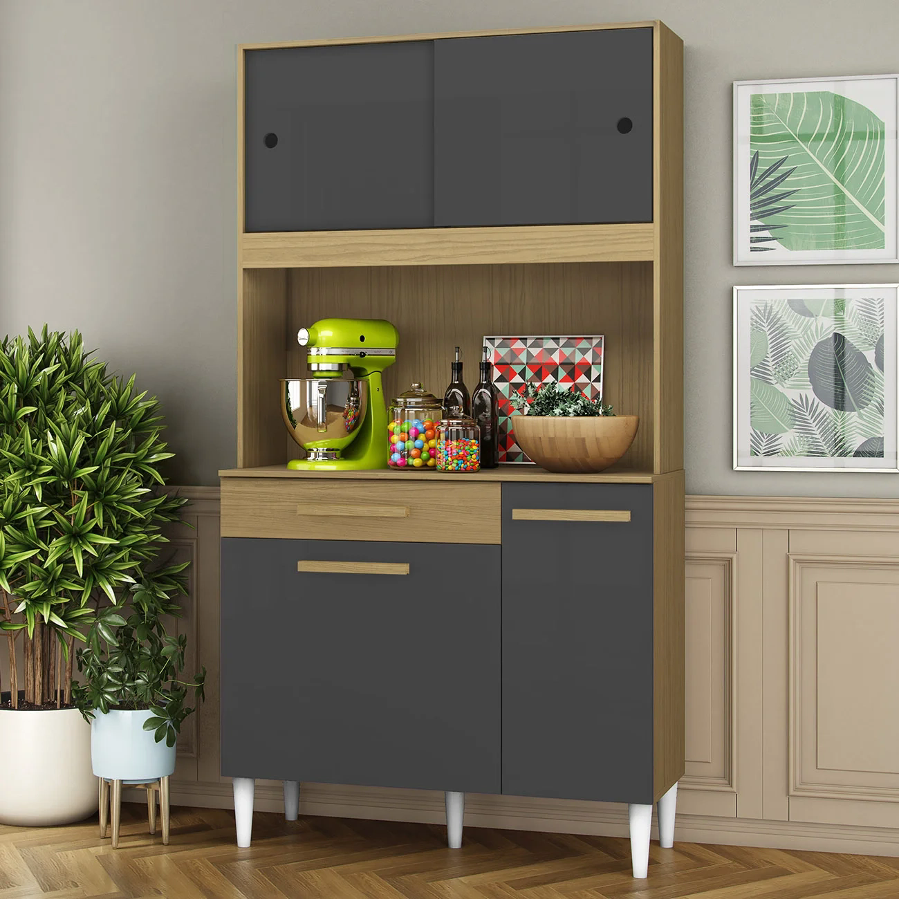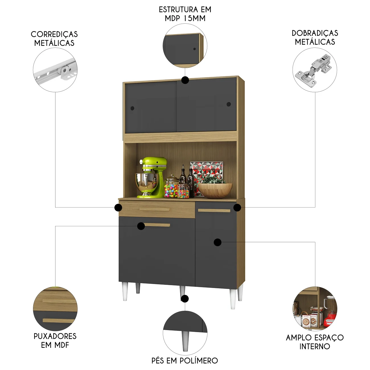 Sua estrutura é em MDP e puxadores de madeira que trazem um charme ao conjunto. Os pés e trilhos das portas deslizantes são em polímero, oferecendo resistência e praticidade na limpeza desse Armário de Cozinha.