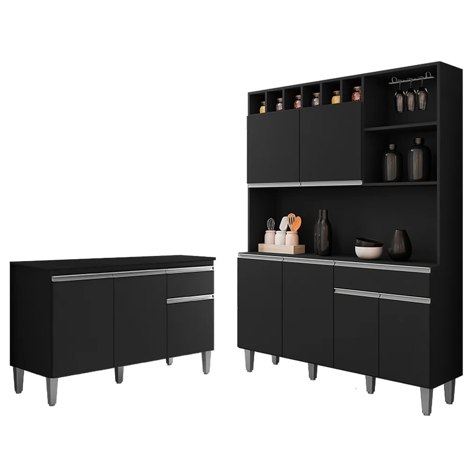 Composto por um Balcão Gabinete para Pia, com 3 portas e 1 gaveta, com amplo espaço interno para panelas, potes e talheres, conta também com tampo para apoio no preparo das refeições. Um armário 6 portas, uma gaveta, um nicho grande para eletroportáteis, e mais 8 nichos menores para itens de decoração, garrafas, condimentos e outros utensílios de Cozinha, sendo um deles já com suporte em inox para taças, incrível né? Além disso esse Kit Cozinha é todo produzido em MDP de alta qualidade, os puxadores em PVC, e as dobradiças e corrediças metálicas garantido mais a qualidade e durabilidade.