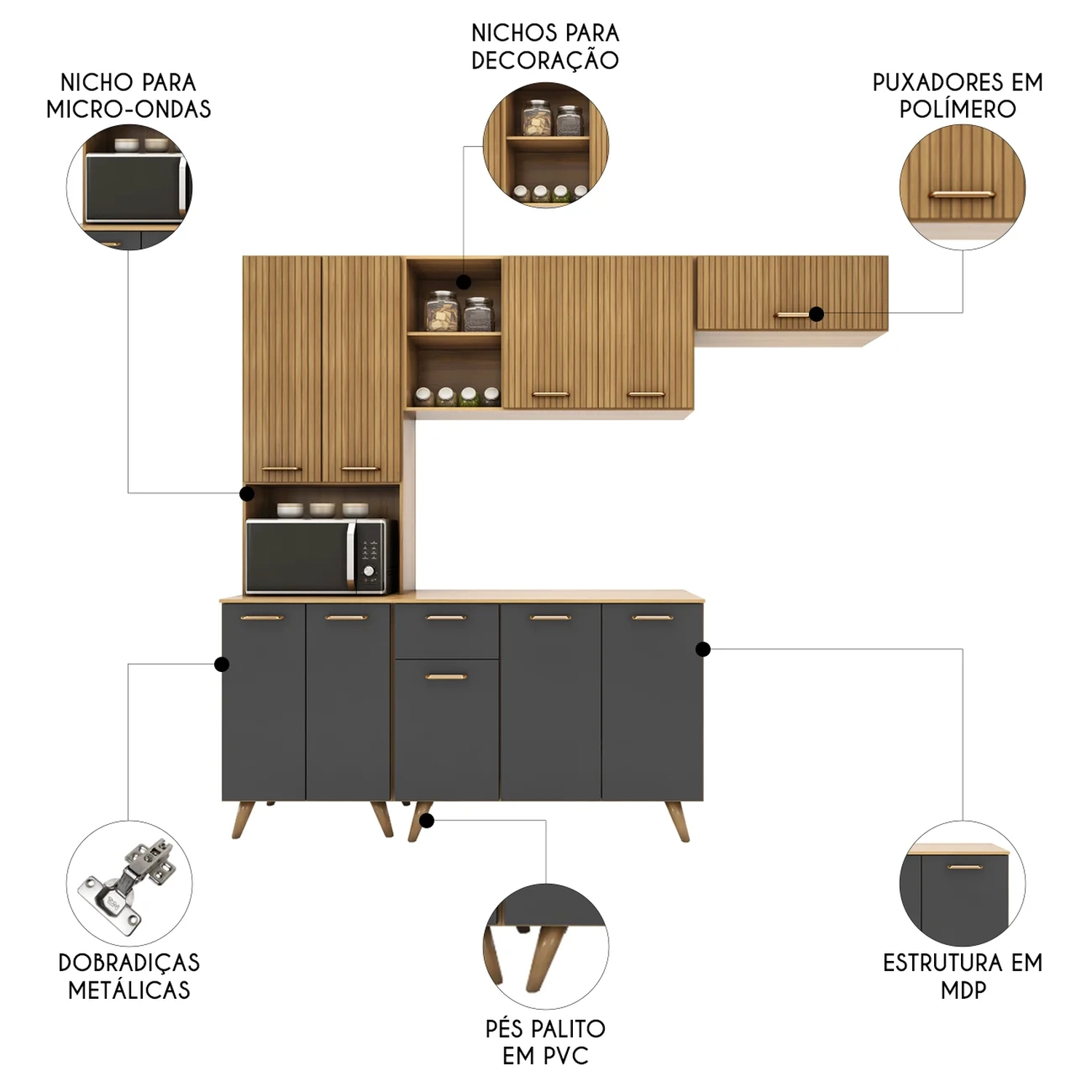O Paneleiro conta com quatro portas que garantem muito mais organização no dia a dia, além de um nicho para micro-ondas ou forno elétrico. Enquanto o Balcão vem com três portas e duas gavetas. Os pés palitos em PVC, trazem um visual retrô e ainda são reguláveis, o que permite ajustar pequenos desníveis de piso e manter a estabilidade do produto.