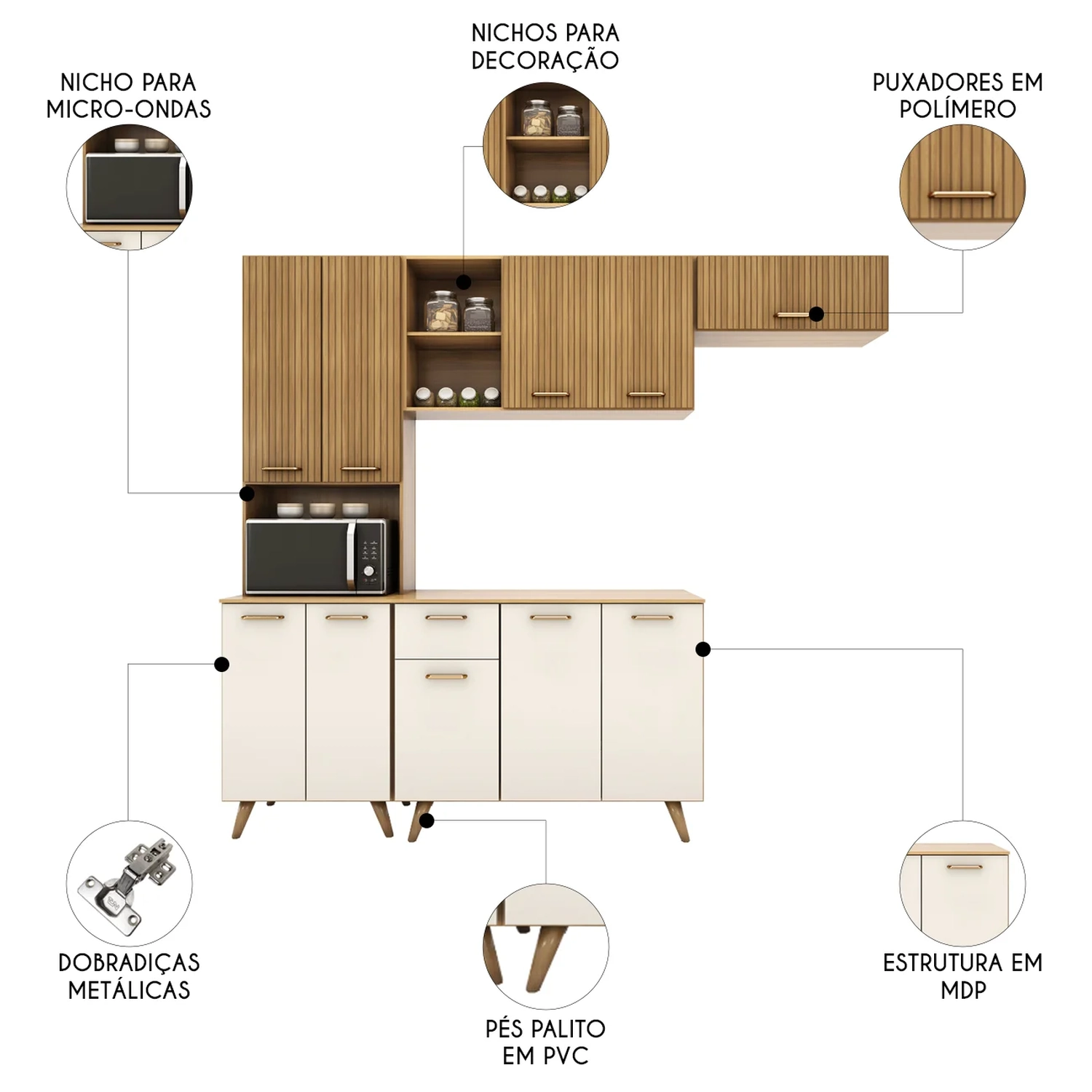 O Paneleiro conta com quatro portas que garantem muito mais organização no dia a dia, além de um nicho para micro-ondas ou forno elétrico. Enquanto o Balcão vem com três portas e duas gavetas. Os pés palitos em PVC, trazem um visual retrô e ainda são reguláveis, o que permite ajustar pequenos desníveis de piso e manter a estabilidade do produto.