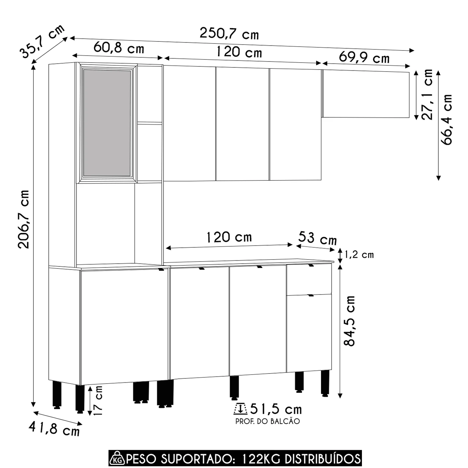 Balcão: 120 x 84,5 x 51,5 cm.
