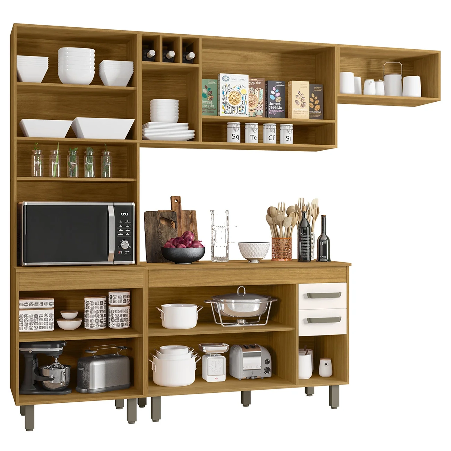 O Paneleiro foi desenvolvido para otimizar o uso do espaço, contando quatro portas para muito mais organização no dia a dia. Inclui um nicho para micro-ondas ou forno elétrico e um nicho decorativo perfeito para expor seus objetos favoritos. O Balcão de Cozinha vem com três portas e duas gavetas, além de um tampo que serve como apoio para eletrodomésticos e itens que precisam ficar sempre à mão.