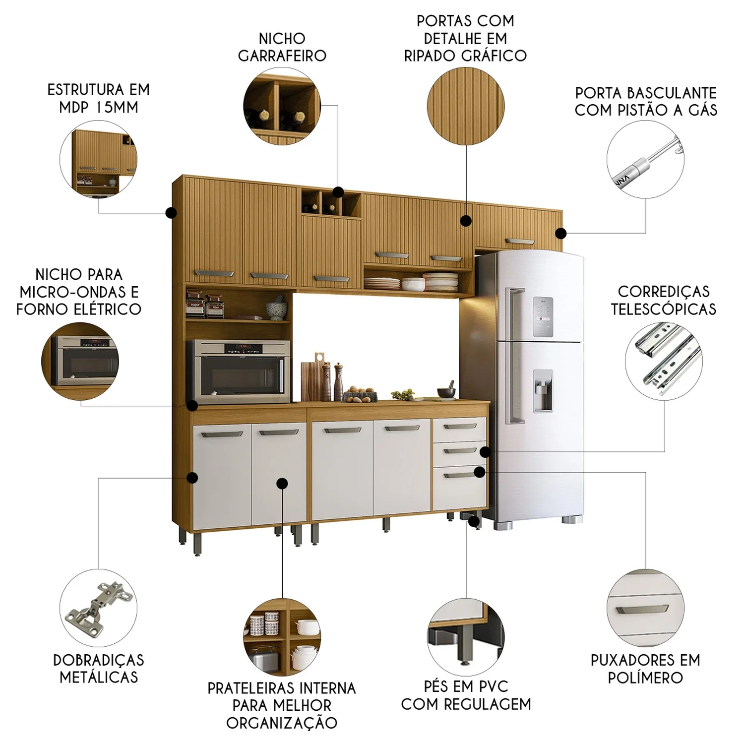 O Armário Aéreo traz ainda mais funcionalidade, com três portas, um nicho para temperos e um nicho adega com três compartimentos. Já o Armário de Geladeira completa a composição com uma porta basculante equipada com pistão a gás, proporcionando um movimento suave e controlado. Com três prateleiras internas, a Cozinha Compacta possui amplo espaço para armazenar seus utensílios e mantimentos de forma pratica e eficiente.