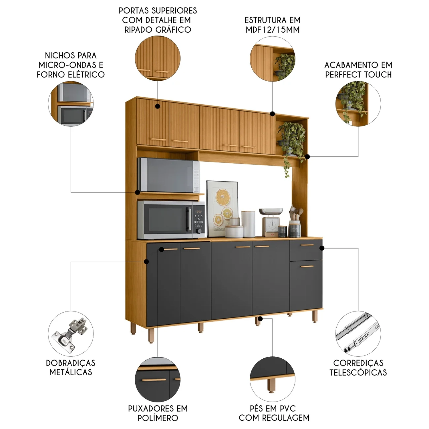 As dobradiças metálicas proporcionam um movimento suave, enquanto os puxadores em polímero conferem um toque sofisticado ao móvel. Fabricado em MDP com acabamento em perffect touch e pintura UV, o Armário de Cozinha garante máxima resistência e durabilidade contra o desgaste diário. Os pés em PVC são reguláveis, isso possibilita ajustar pequenos desníveis de piso e manter a estabilidade do produto.