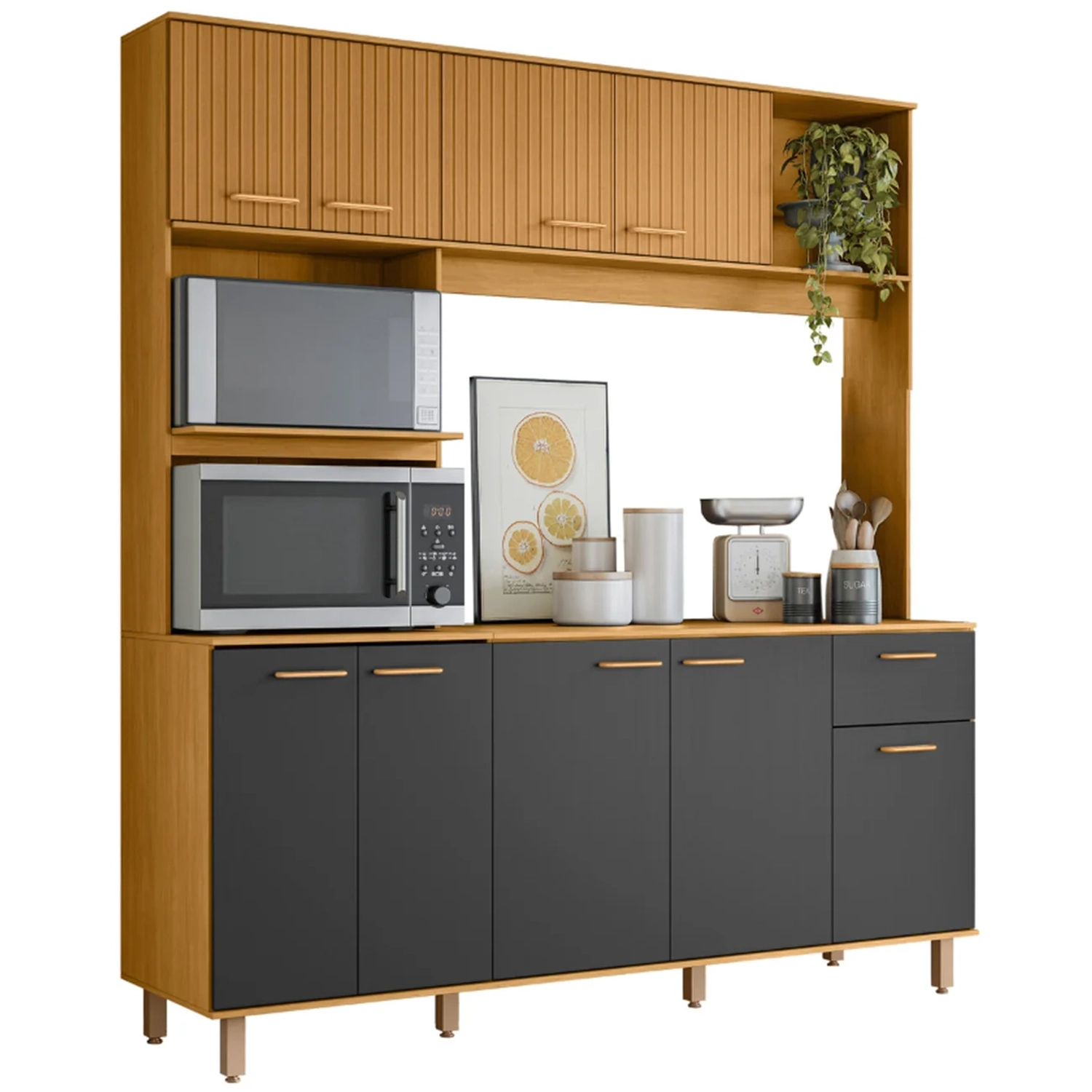 O Armário conta com Nicho Para Micro-ondas e forno elétrico, reunindo seus eletrodomésticos em um só lugar de maneira prática e acessível. Também possui um nicho decorativo, perfeito para exibir seus itens favoritos, trazendo ainda mais personalidade à sua cozinha. O tampo é um excelente apoio servindo como complemento para que tudo fique sempre ao alcance das mãos.