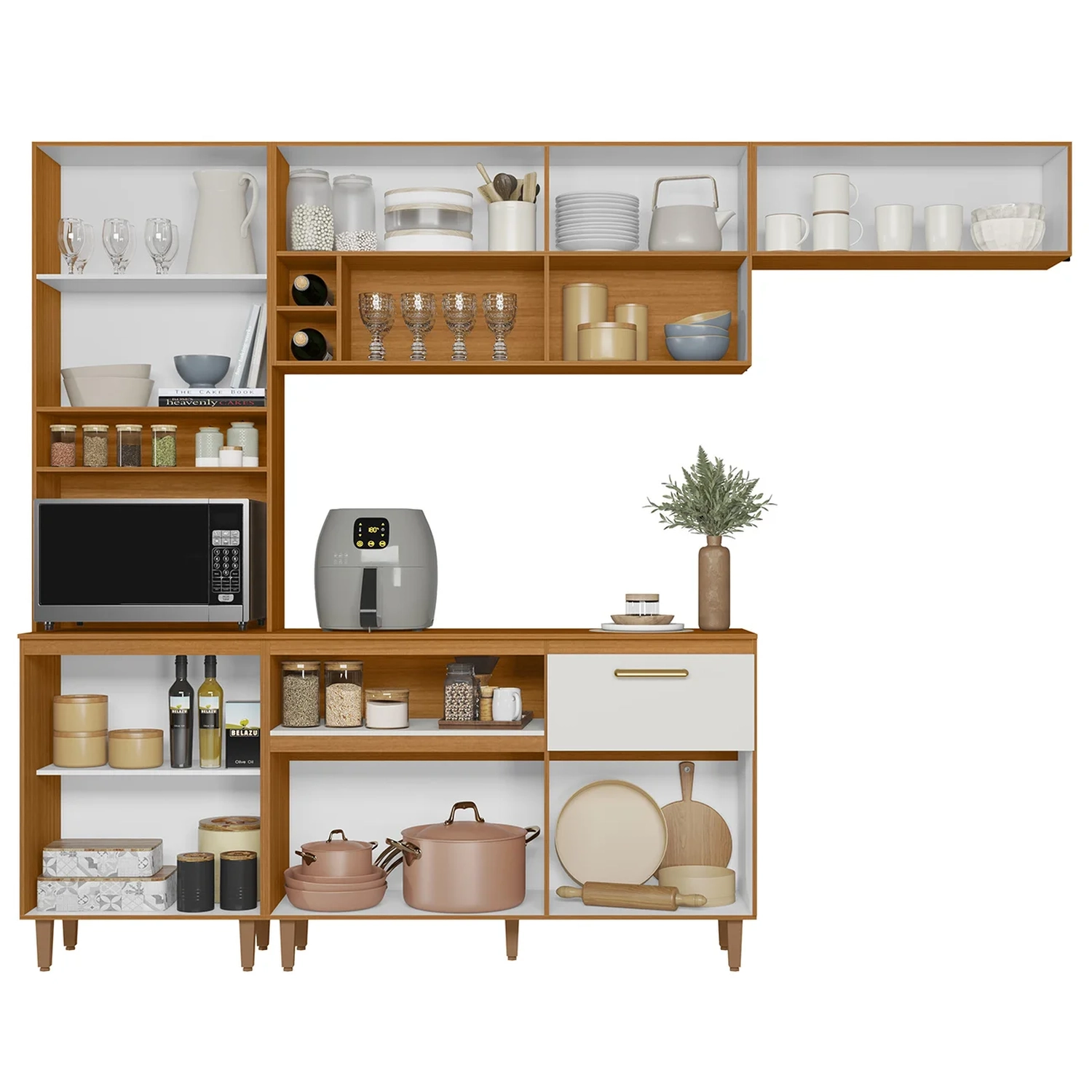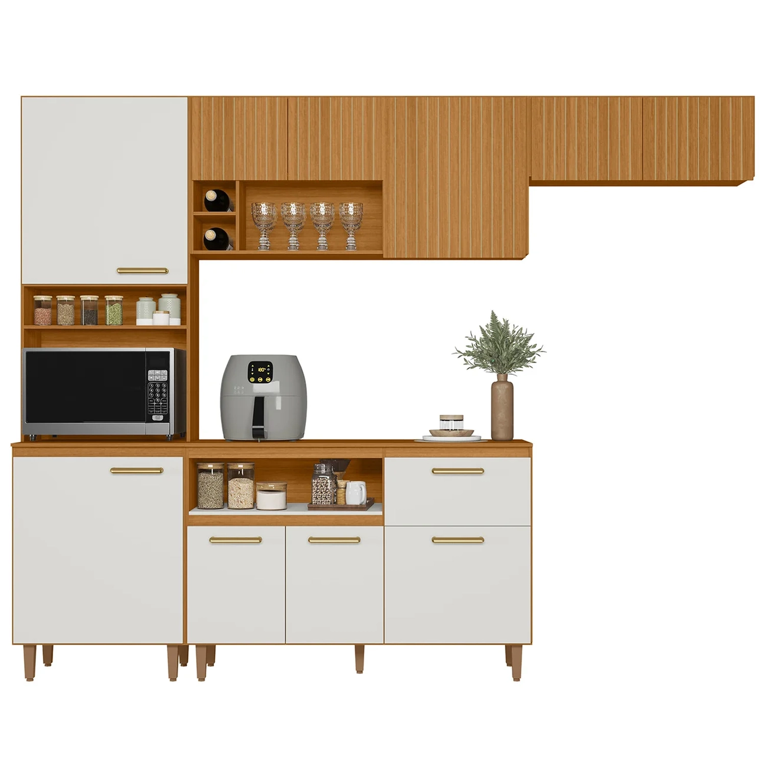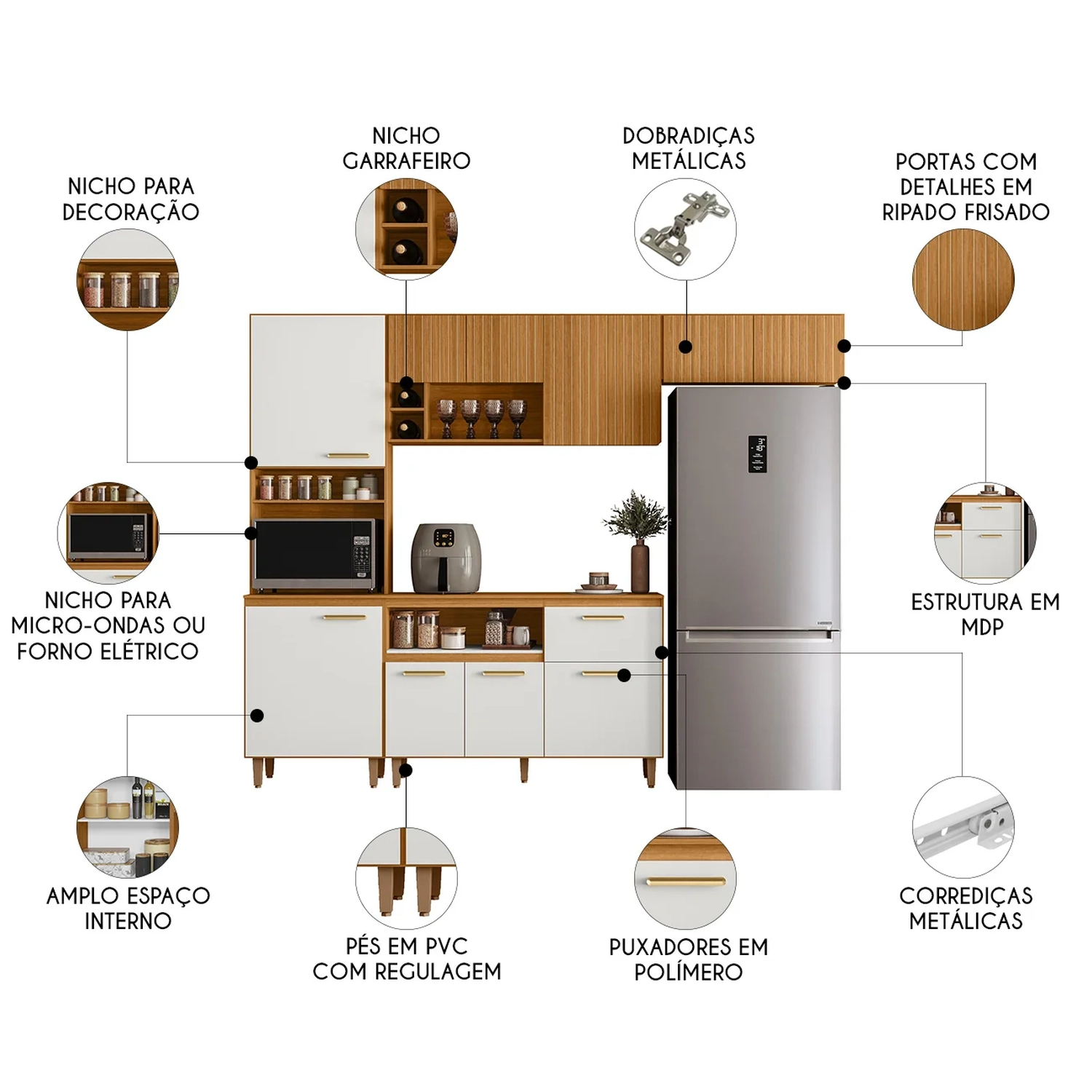 O Armário de Cozinha é composto por um Paneleiro com duas portas, um compartimento para micro-ondas ou forno elétrico e um nicho para temperos. O Armário Aéreo conta com três portas com detalhe em ripado frisado, além de um nicho decorativo e dois nichos adega para acomodar seus rótulos favoritos. Já o Armário de Geladeira acompanha duas portas com o mesmo detalhe ripado, garantindo um visual harmonioso.