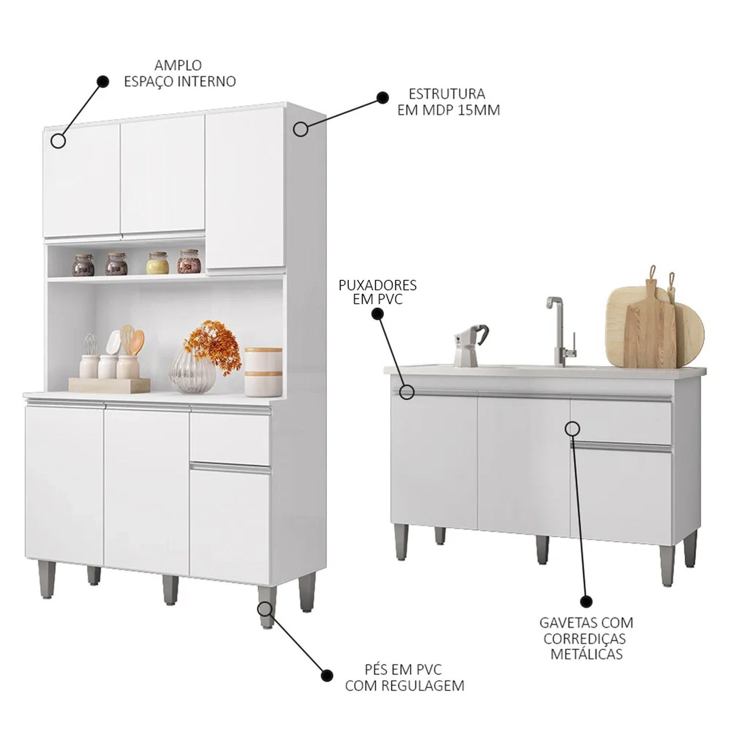 Conteúdo da Embalagem: 1 Armário, 1 Balcão, 1 Pia.
