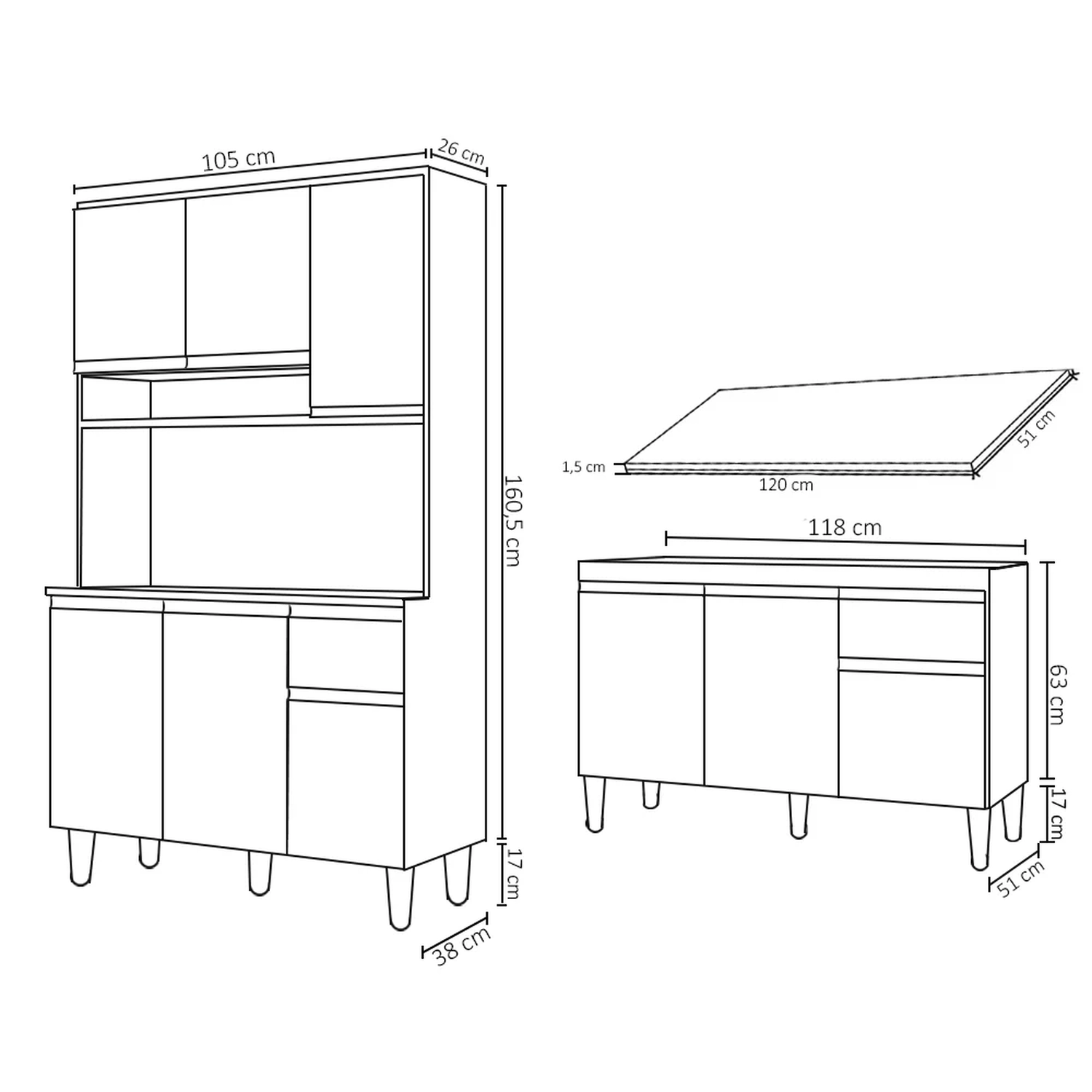 Conteúdo da Embalagem: 1 Armário, 1 Balcão, 1 Tampo.
