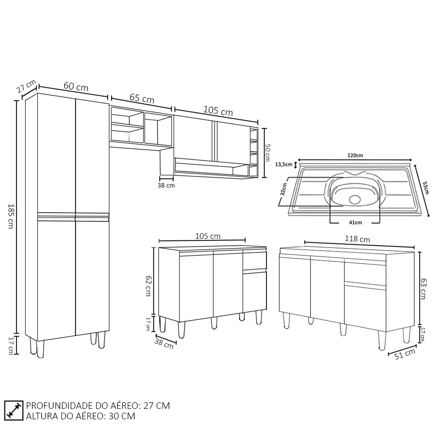 Conteúdo da Embalagem: 1 Balcão 120cm, 1 Balcão 105cm, 2 Armários Aéreos, 1 Paneleiro, 1 Pia.