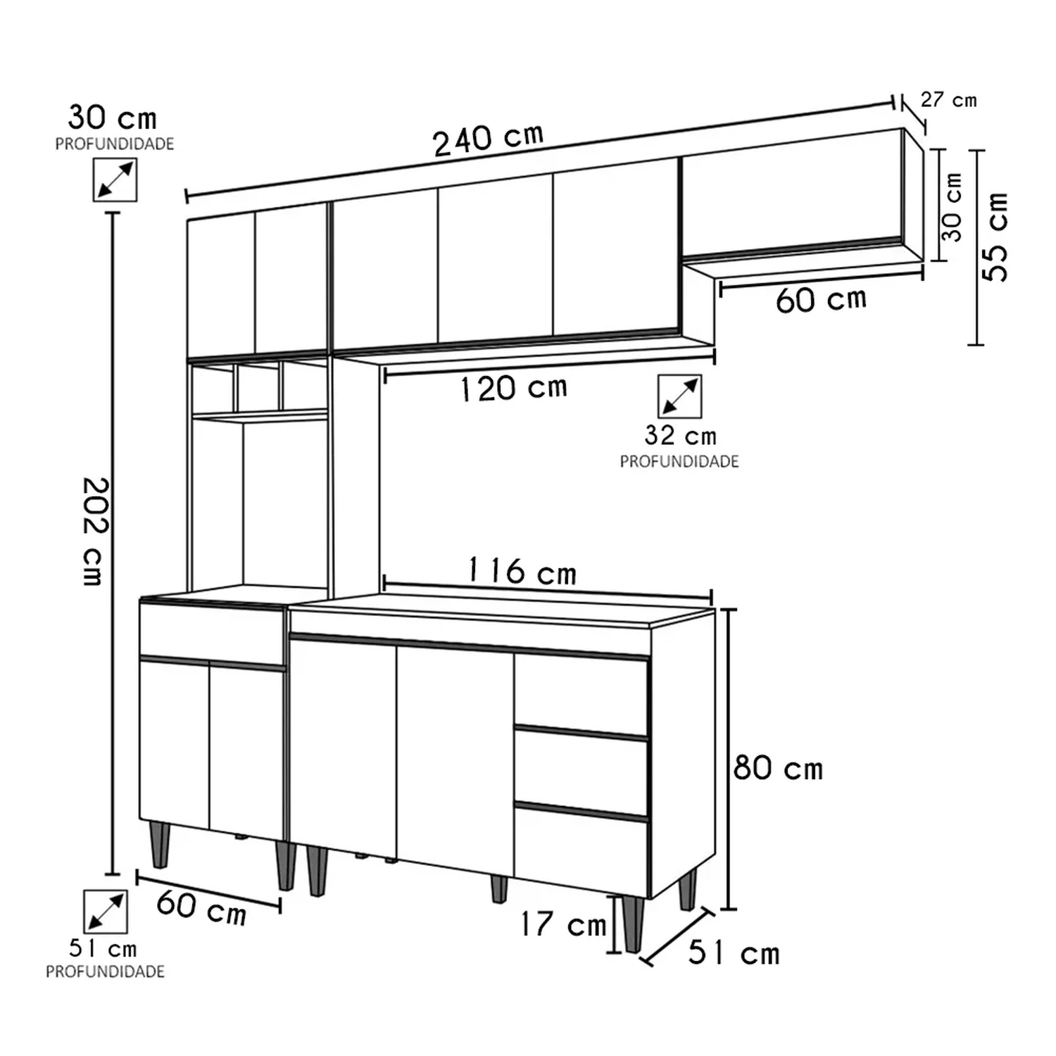 Conteúdo da Embalagem: 1 Balcão 120cm, 1 Armário Aéreo 120cm, 1 Armário Aéreo 60cm, 1 Paneleiro.