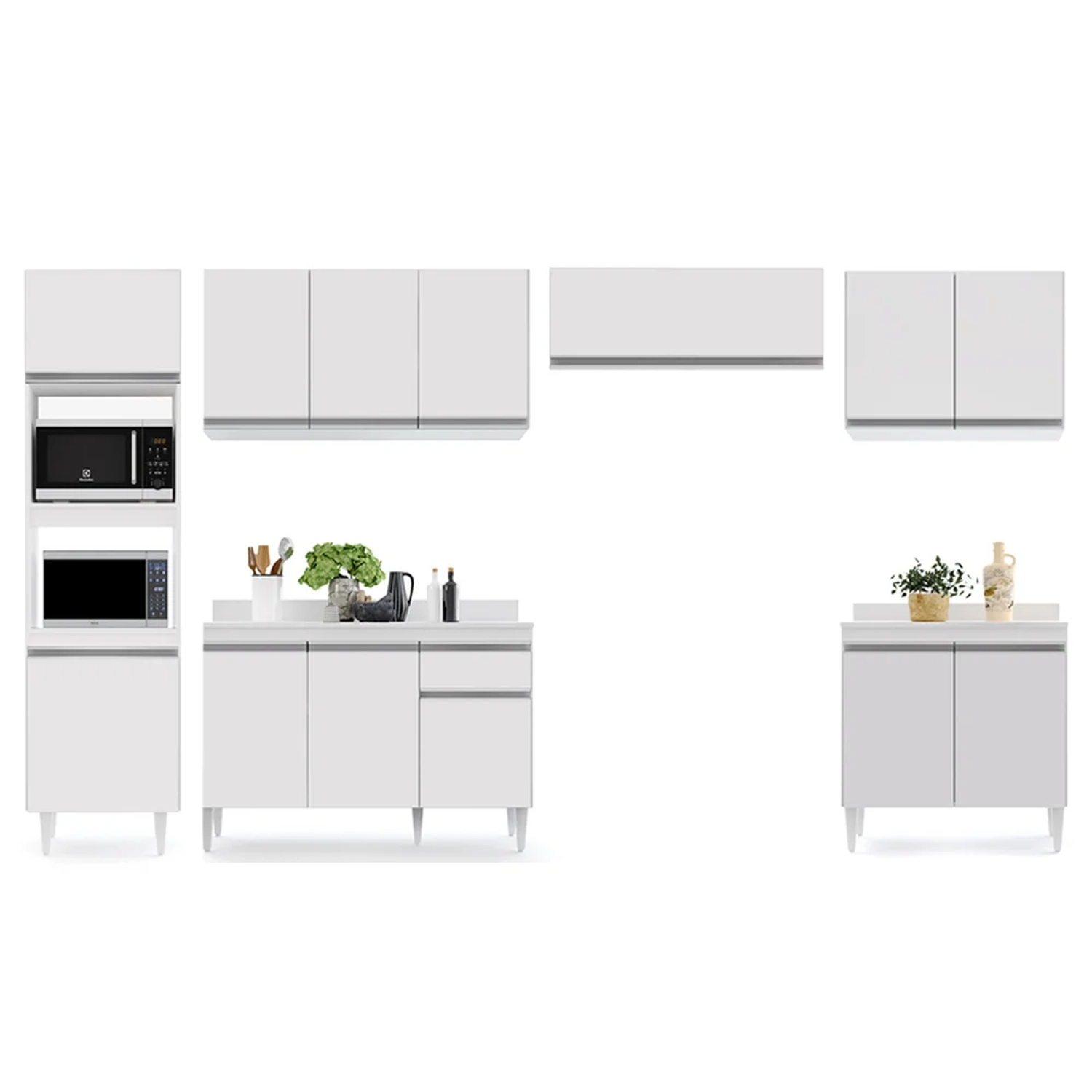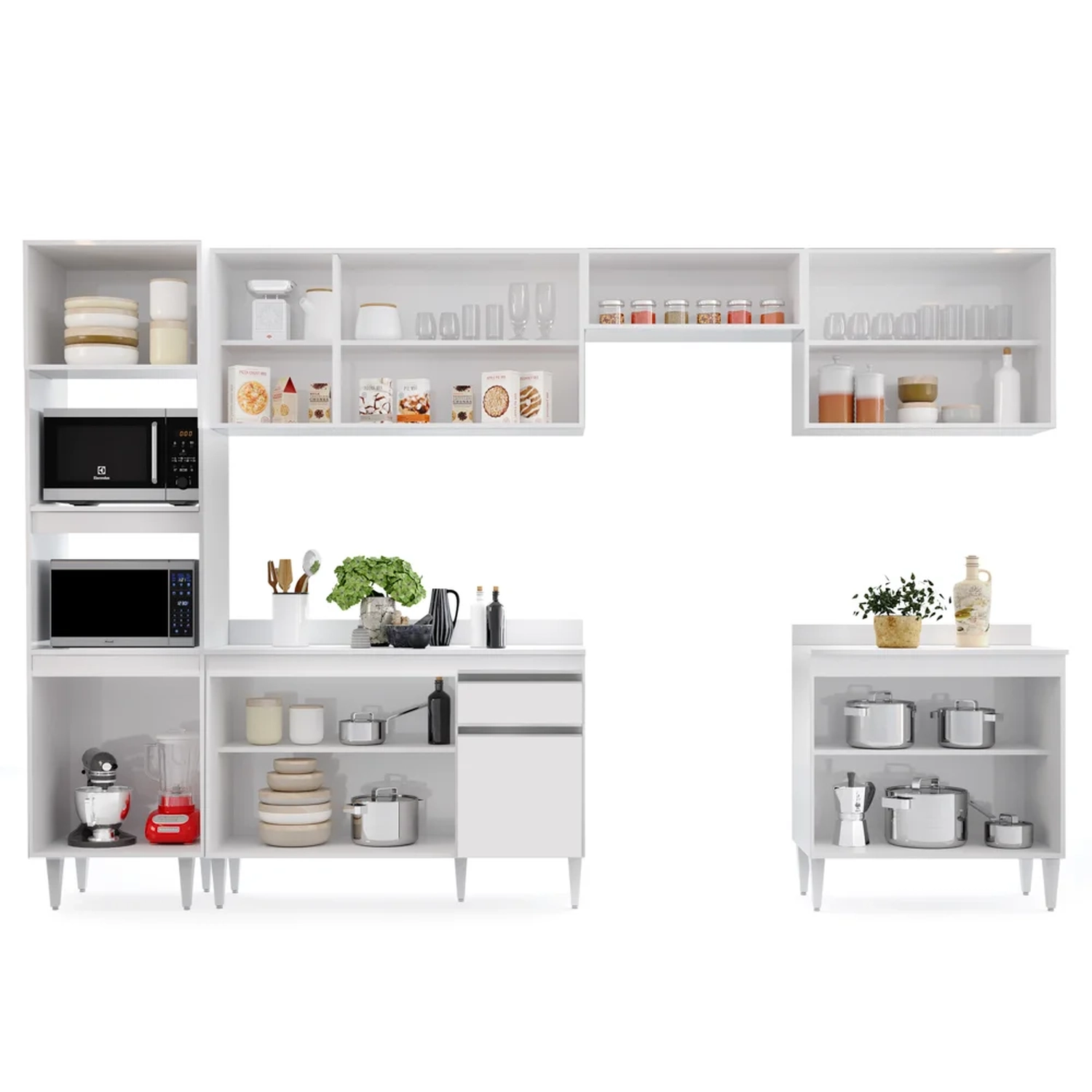 A Cozinha Modulada 6 Módulos Composição 8 Branco - Lumil é fantástica, ela possui um Paneleiro Torre Quente, que além de ampla, pode receber Microondas ou Forno elétrico. Os Balcões Aéreos permitem armazenar seus pratos, talheres, aquele monte de potes que você comprou e não sabe aonde guardar... O que mais chama atenção neste bonito Kit de Cozinha é o uso do MDP BP, que garante uma maior resistência à riscos e arranhões, além de um visual moderno e inspirador.