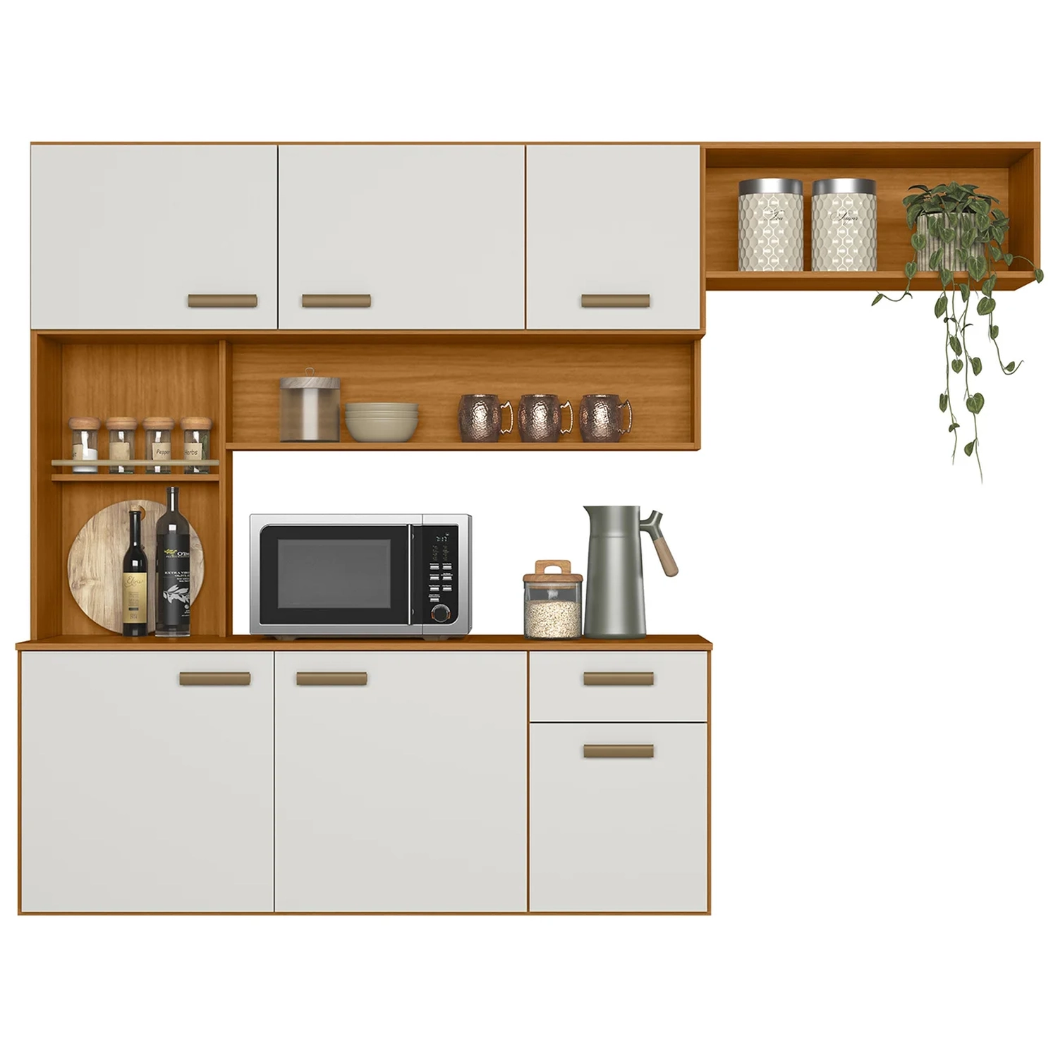 Composta por seis portas, uma gaveta e uma prateleira interna, essa Cozinha Suspensa oferece excelente capacidade de armazenamento. As dobradiças e corrediças metálicas proporcionam uma abertura suave e segura, enquanto os puxadores em polímero adicionam um toque sofisticado que harmoniza com diversos estilos de decoração.