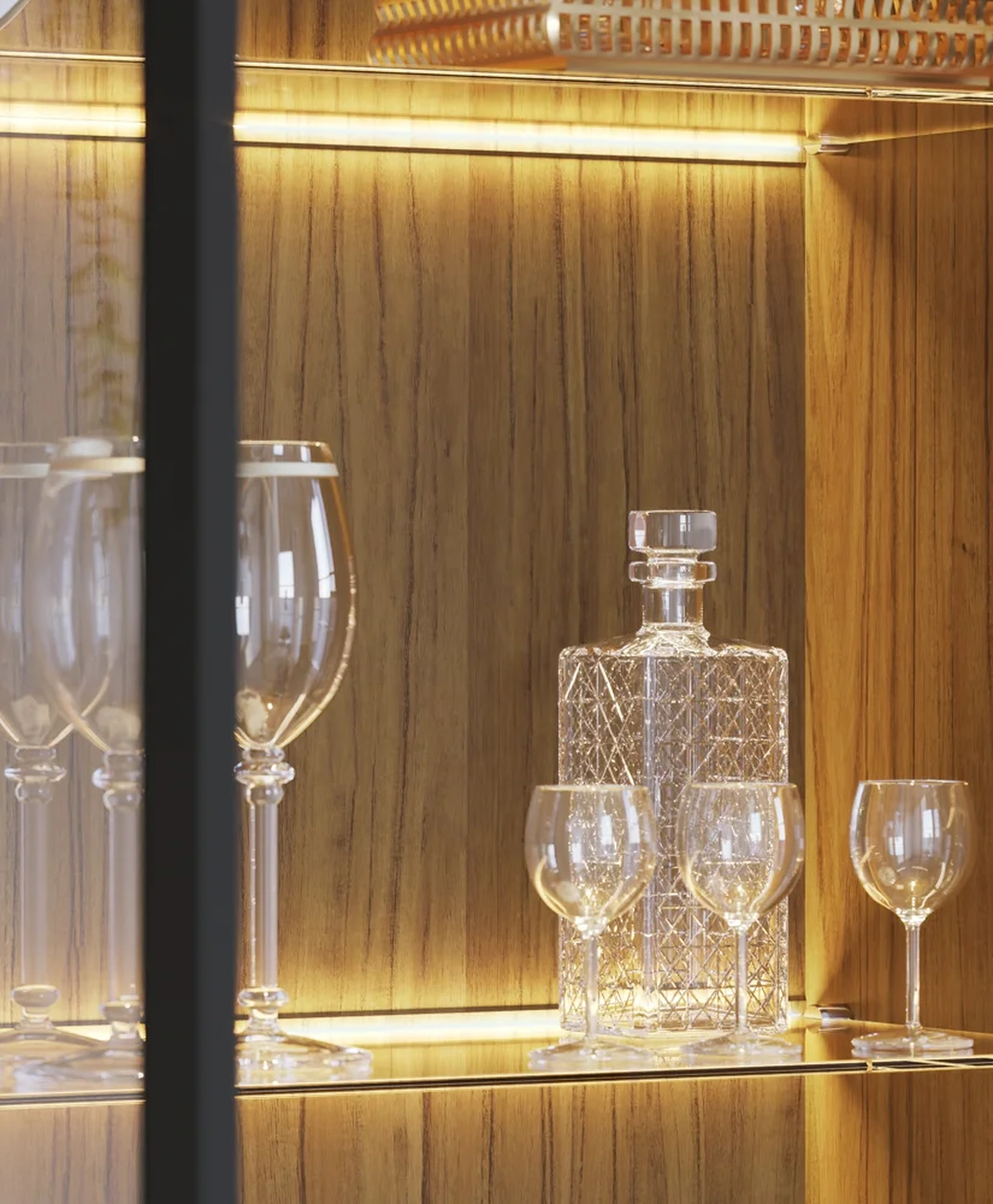 - Fita de LED atrás das prateleiras de vidro.