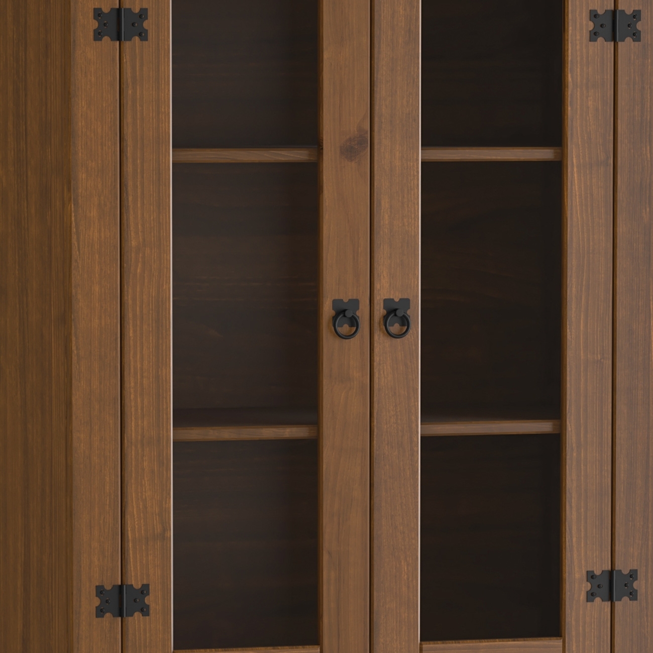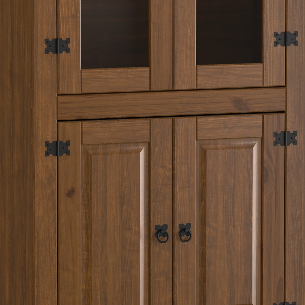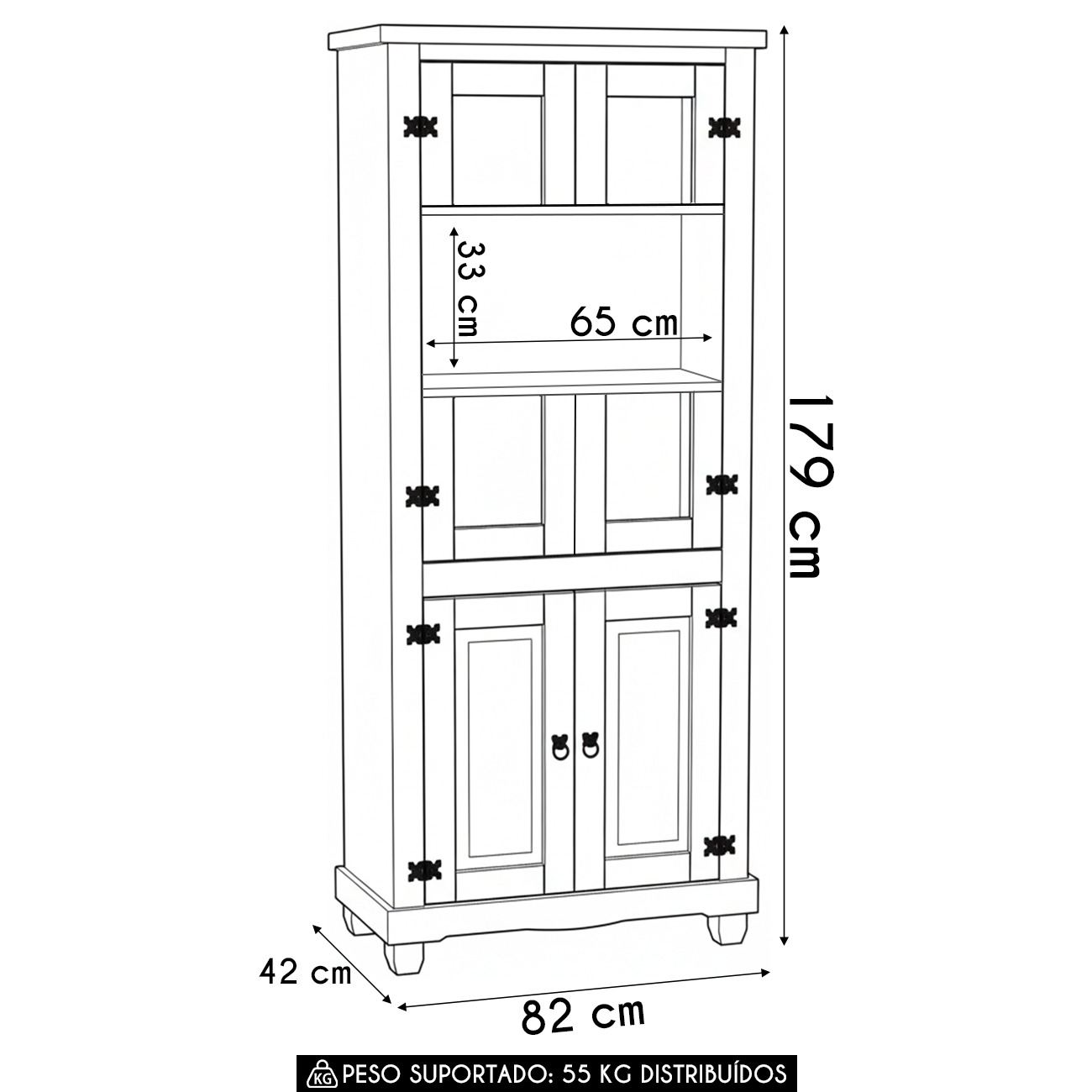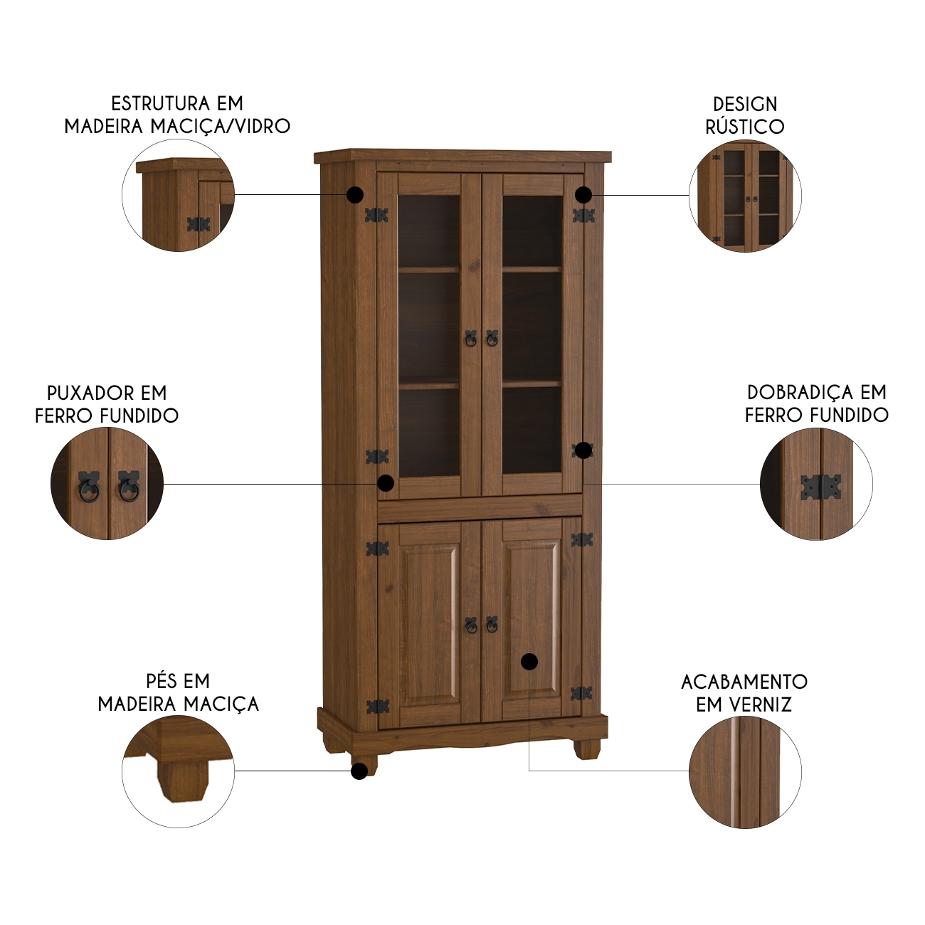A estrutura em madeira maciça garante resistência e estabilidade, enquanto portas de vidro e madeira com detalhe almofada conferem sofisticação e autenticidade ao móvel.