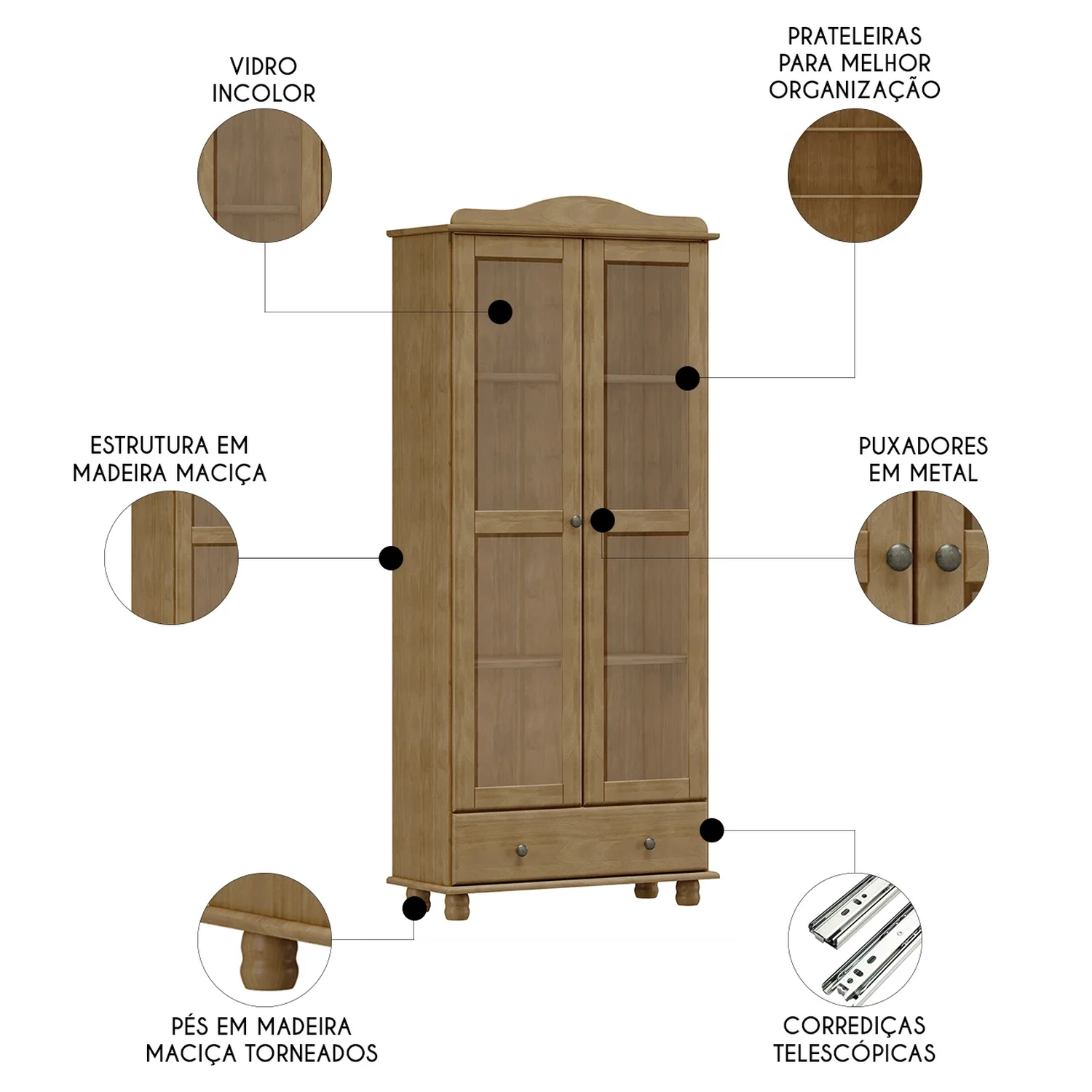 Material da Porta: Madeira Maciça/Vidro Liso Incolor.
