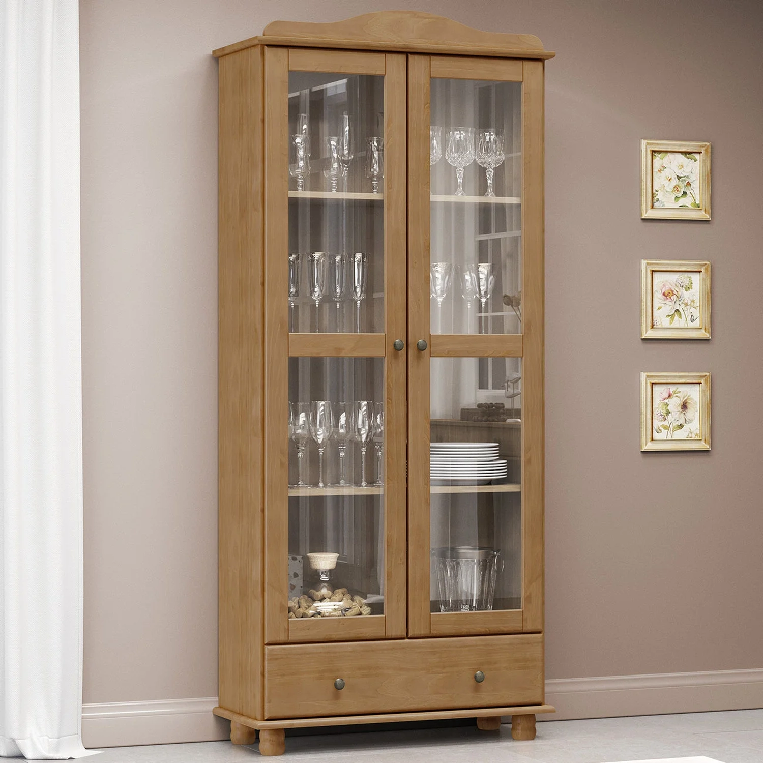 Com amplas prateleiras e gaveta com corrediças telescópicas, essa Cristaleira Para Sala oferece muito espaço para organização e exposição. Tanto as portas quanto a gaveta possuem puxadores metálicos em ouro envelhecido, além de ter uma moltura superior agregando um toque de requinte e sofisticação ao design.