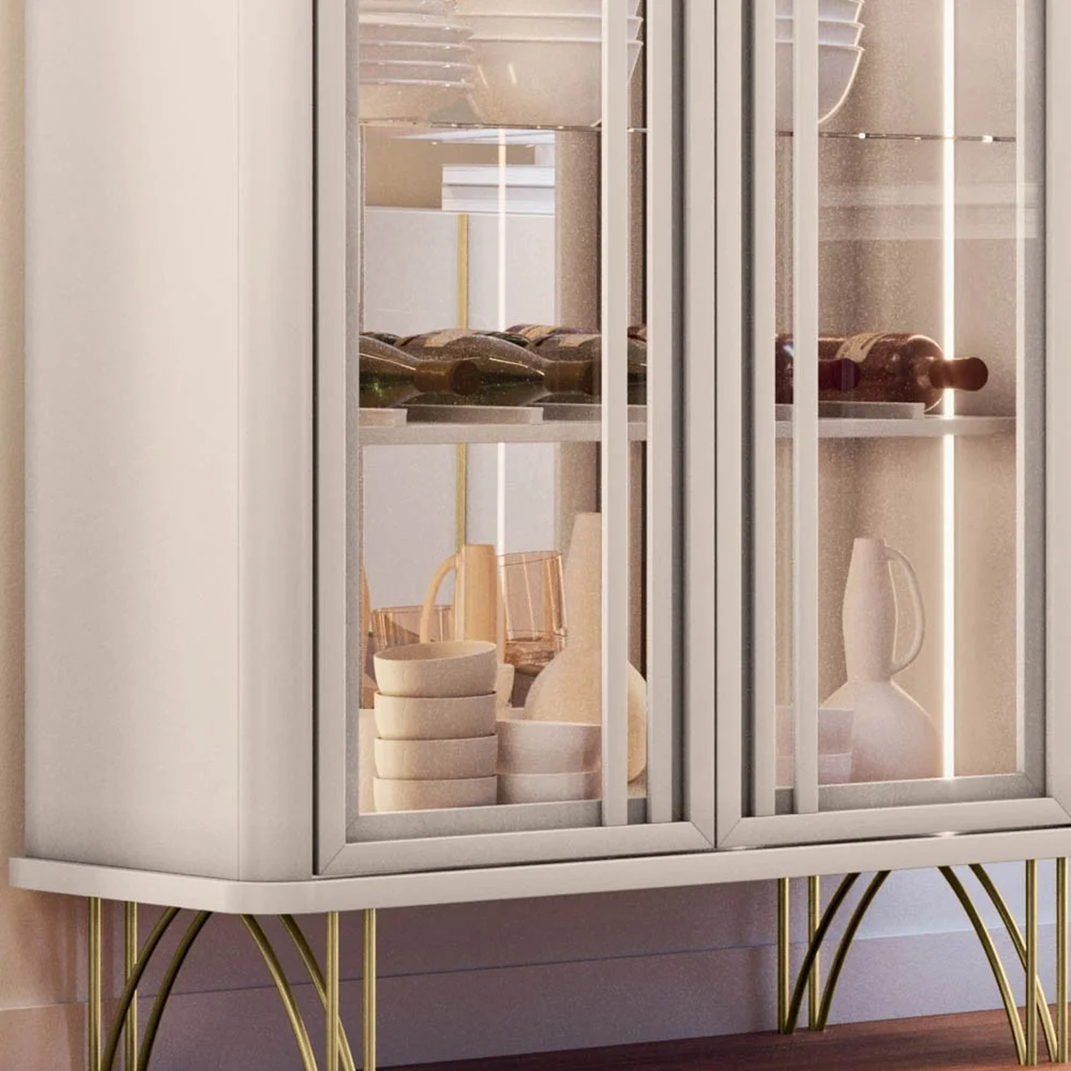Ela possui portas de vidro emolduradas e cantos arredondados, que conferem um design moderno e harmonioso. O sistema de abertura e fecho toque facilita o manuseio e evita marcas de dedos nas portas. A iluminação LED nas laterais cria um efeito luminoso e valoriza os itens expostos. A Cristaleira conta ainda com três prateleiras de vidro de 6mm de espessura, e uma adega com divisórias para seis garrafas, perfeita para organizar seus vinhos favoritos. O fundo da cristaleira é revestido com espelhos de 3mm, que ampliam o espaço e refletem a luz. A estrutura da cristaleira é feita de MDF de alta qualidade, resistente e durável. Os pés de aço maciço em tom dourado complementam o visual sofisticado e garantem a estabilidade do móvel. A Cristaleira de Vidro é uma peça versátil e funcional, que pode ser usada na Sala De Jantar, na Sala De Estar ou no hall de entrada, dando um toque de charme e requinte ao seu ambiente.