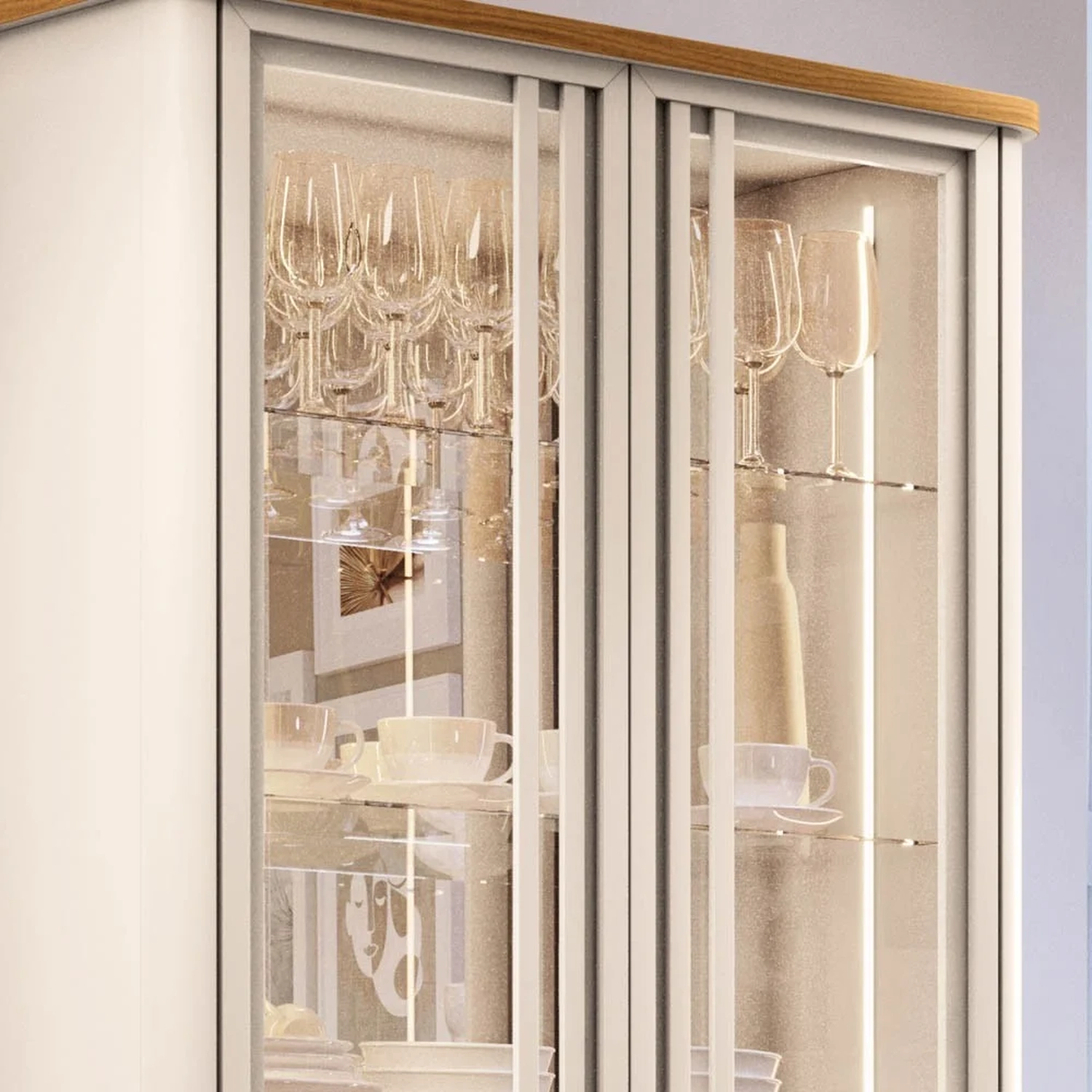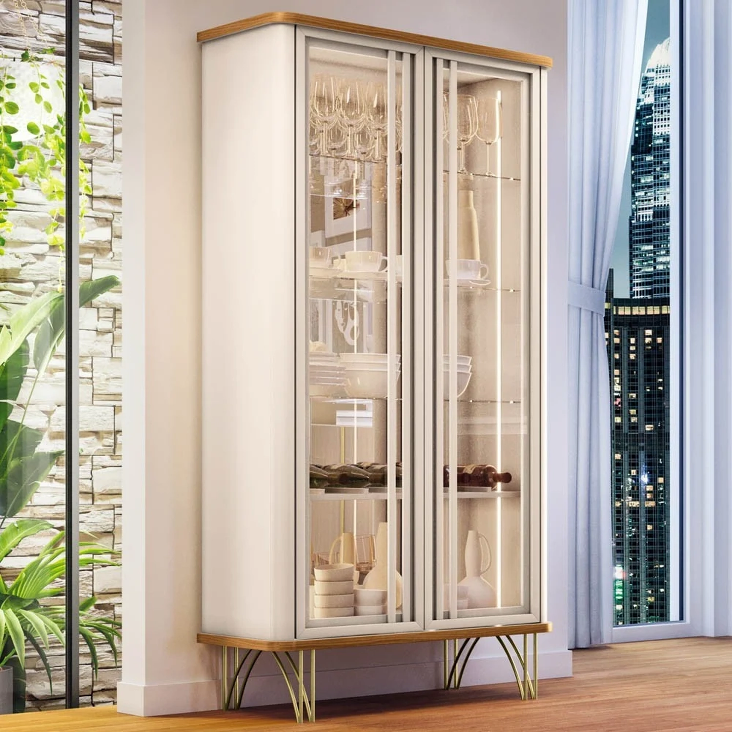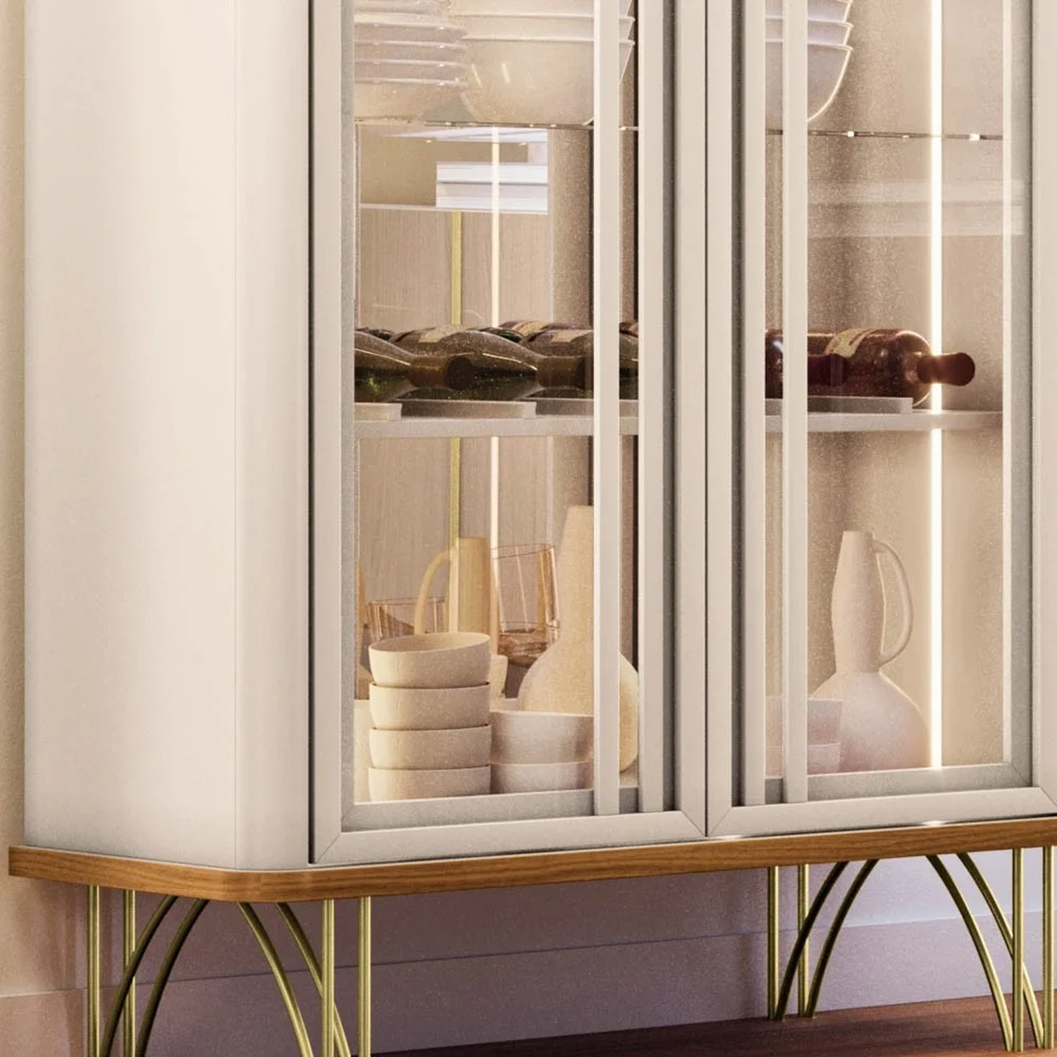 Ela possui portas de vidro emolduradas e cantos arredondados, que conferem um design moderno e harmonioso. O sistema de abertura e fecho toque facilita o manuseio e evita marcas de dedos nas portas. A iluminação LED nas laterais cria um efeito luminoso e valoriza os itens expostos. A Cristaleira conta ainda com três prateleiras de vidro de 6mm de espessura, e uma adega com divisórias para seis garrafas, perfeita para organizar seus vinhos favoritos. O fundo da cristaleira é revestido com espelhos de 3mm, que ampliam o espaço e refletem a luz. A estrutura da cristaleira é feita de MDF de alta qualidade, resistente e durável. Os pés de aço maciço em tom dourado complementam o visual sofisticado e garantem a estabilidade do móvel. A Cristaleira de Vidro é uma peça versátil e funcional, que pode ser usada na Sala De Jantar, na Sala De Estar ou no hall de entrada, dando um toque de charme e requinte ao seu ambiente.