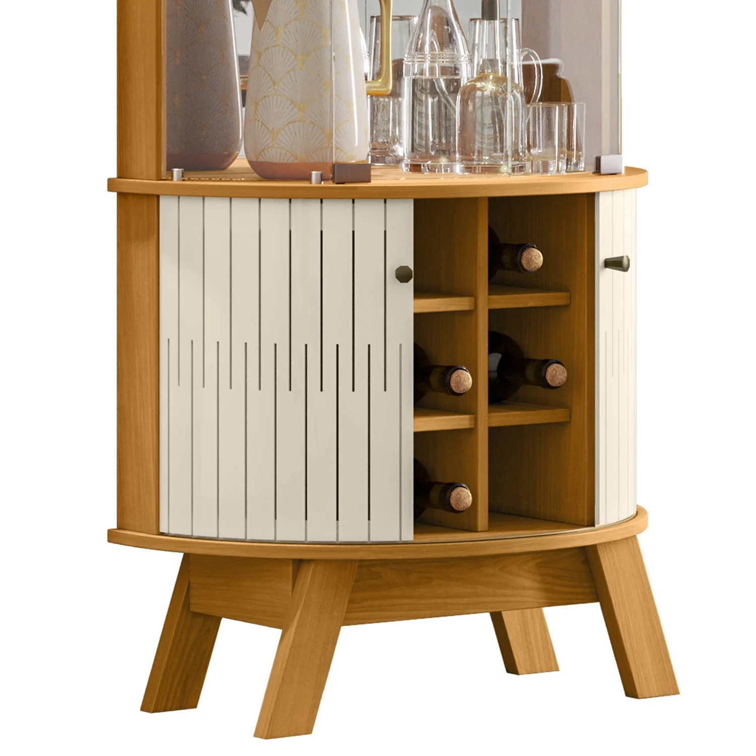 Com seu design sofisticado e funcional, ela se destaca pela capacidade de organizar e exibir seus objetos decorativos com estilo. Com quatro portas de vidro deslizantes, a Cristaleira de Vidro permite uma visualização clara dos itens armazenados, enquanto mantém tudo protegido e organizado. As prateleiras de vidro e os espelhos realçam a beleza dos objetos expostos, criando um efeito visual encantador. Os quatro pés garantem estabilidade e um toque moderno ao móvel. Fabricada em MDP, a Cristaleira é resistente e durável. Com iluminação LED integrada e puxadores em plástico, ela oferece praticidade e um acabamento sofisticado, a Cristaleira com Adega proporciona um espaço compacto e elegante para a exposição de cristais e objetos decorativos, destacando-os de forma única e charmosa.
