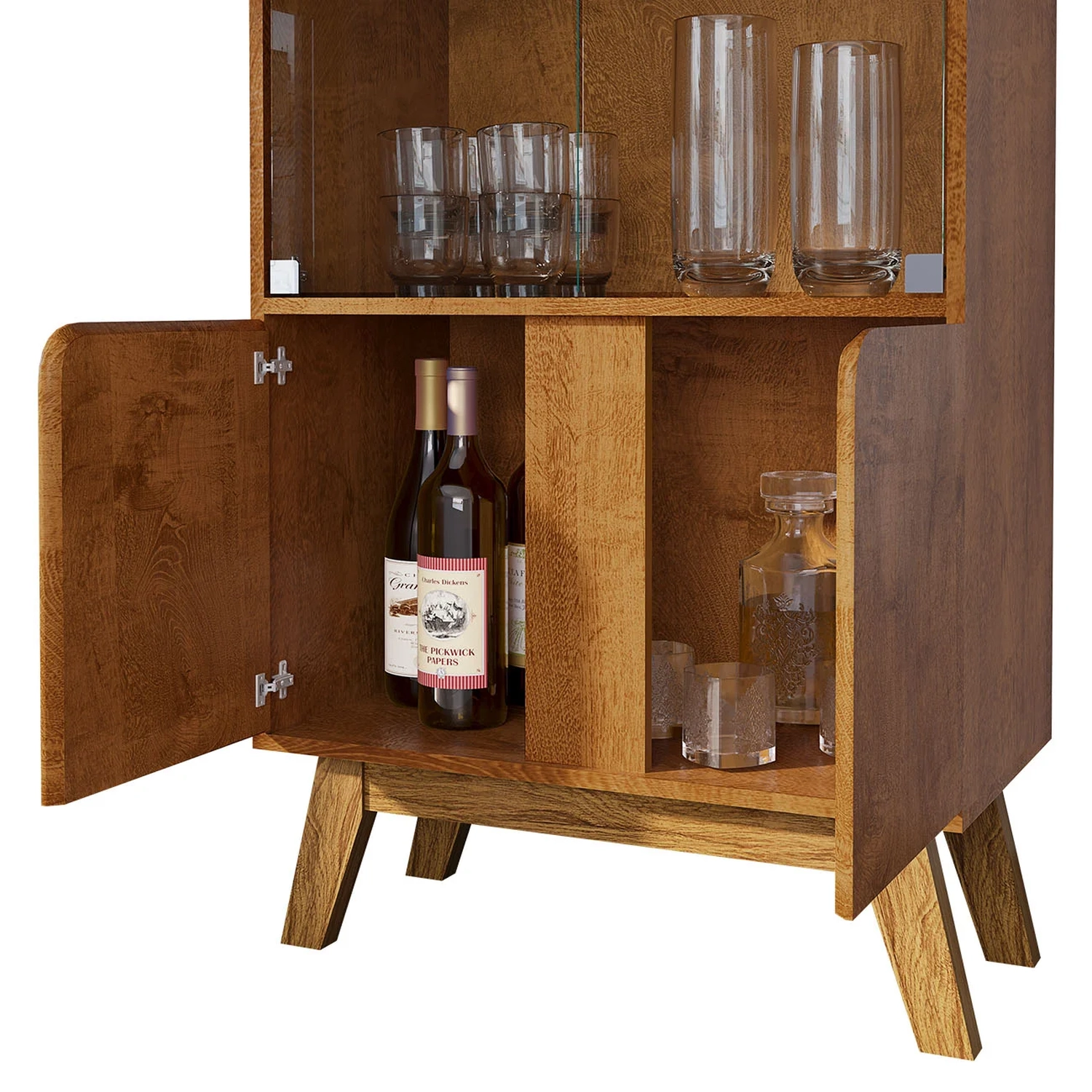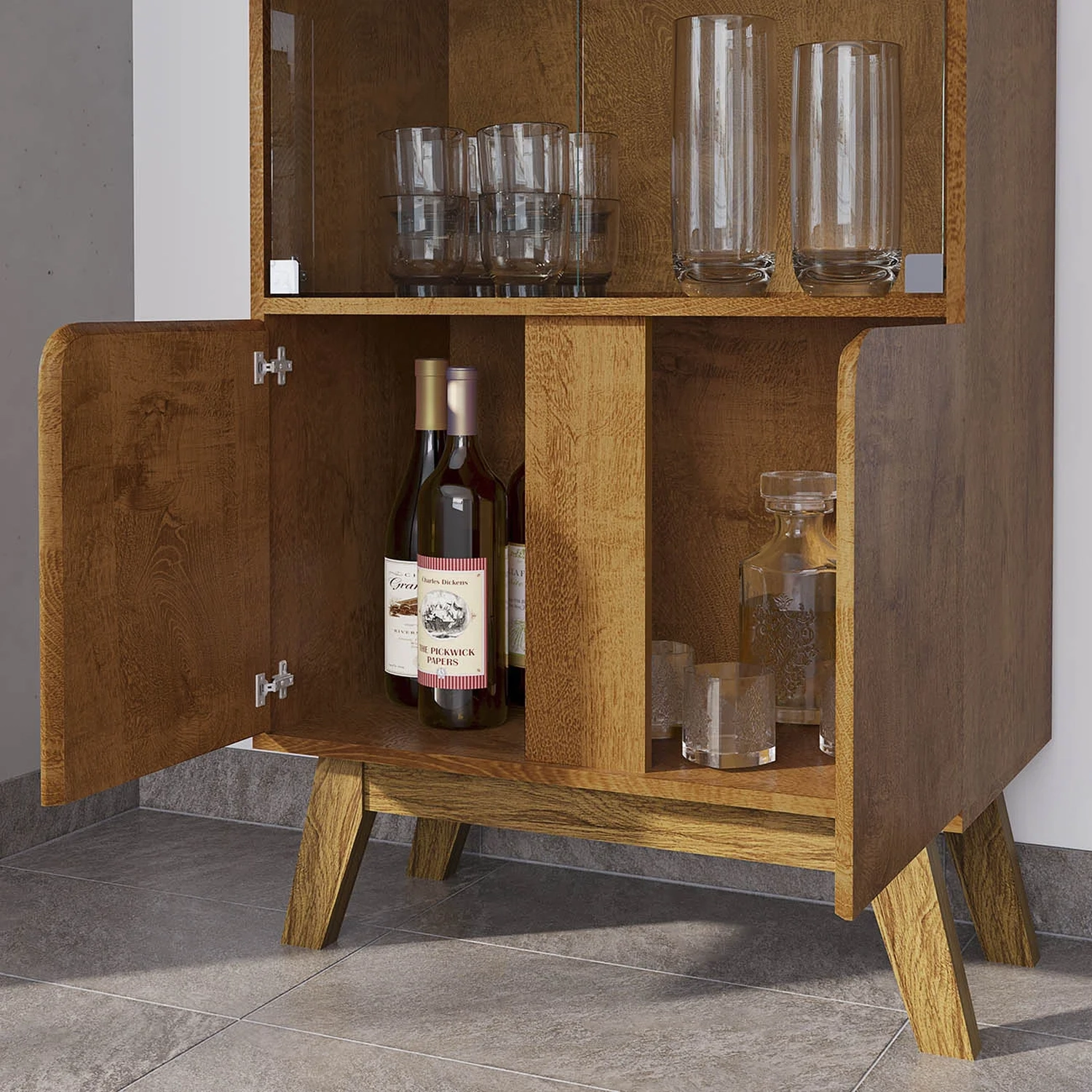 Conta com amplo espaço interno dividido por duas prateleiras, perfeitas para organizar bebidas, taças e objetos decorativos com praticidade e estilo.