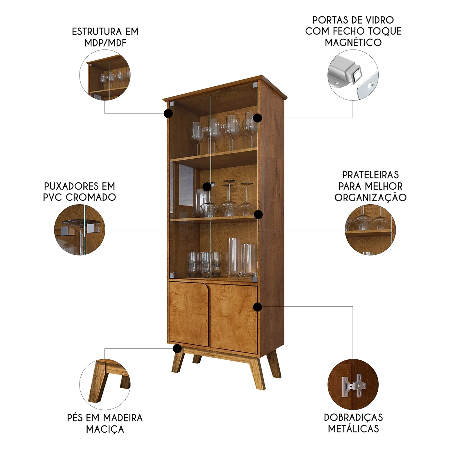 Cristaleira Porta de Vidro 70cm Pés Retrô Madri Naturalle - Bechara