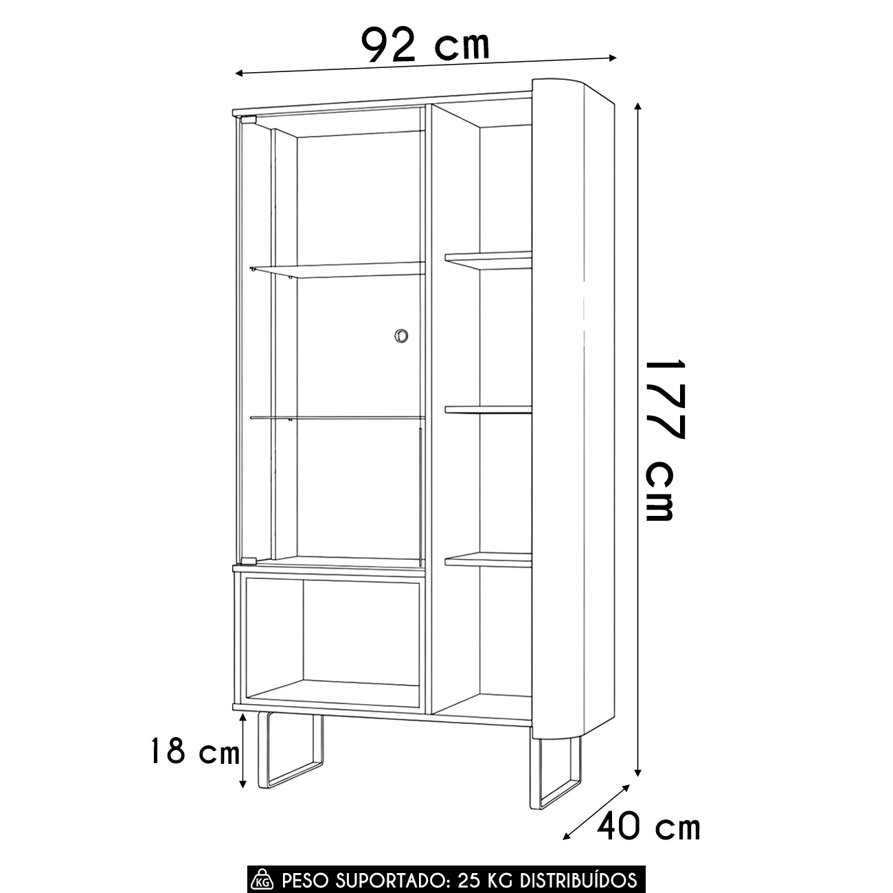 A estrutura possui uma porta convencional com combinação de vidro e MDF, além de cinco prateleiras internas que ampliam o armazenamento de forma funcional.