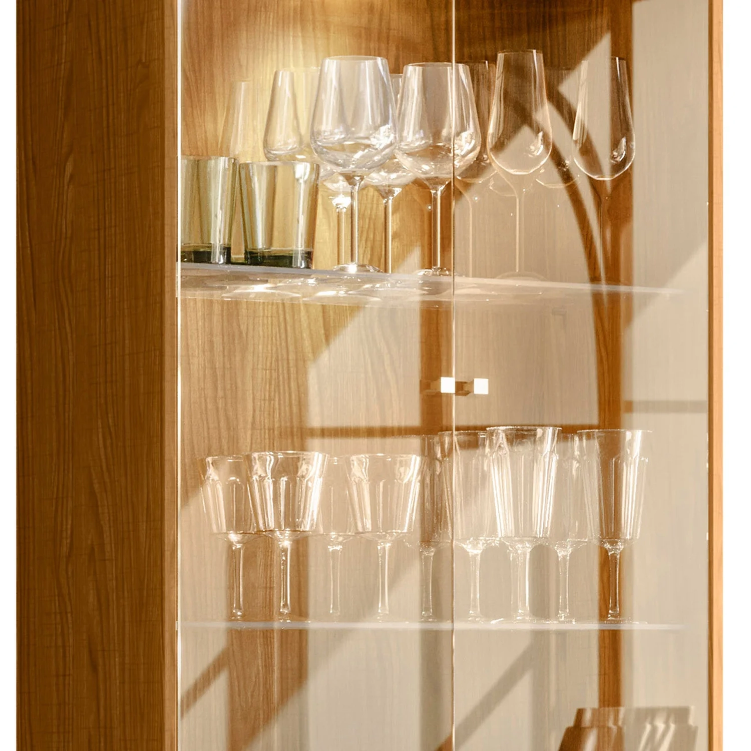 Na parte superior, a Cristaleira conta com portas e prateleiras em vidro, além de uma adega integrada para armazenar garrafas com segurança. A iluminação LED embutida, acionada por interruptor interno, realça os itens com um toque acolhedor.