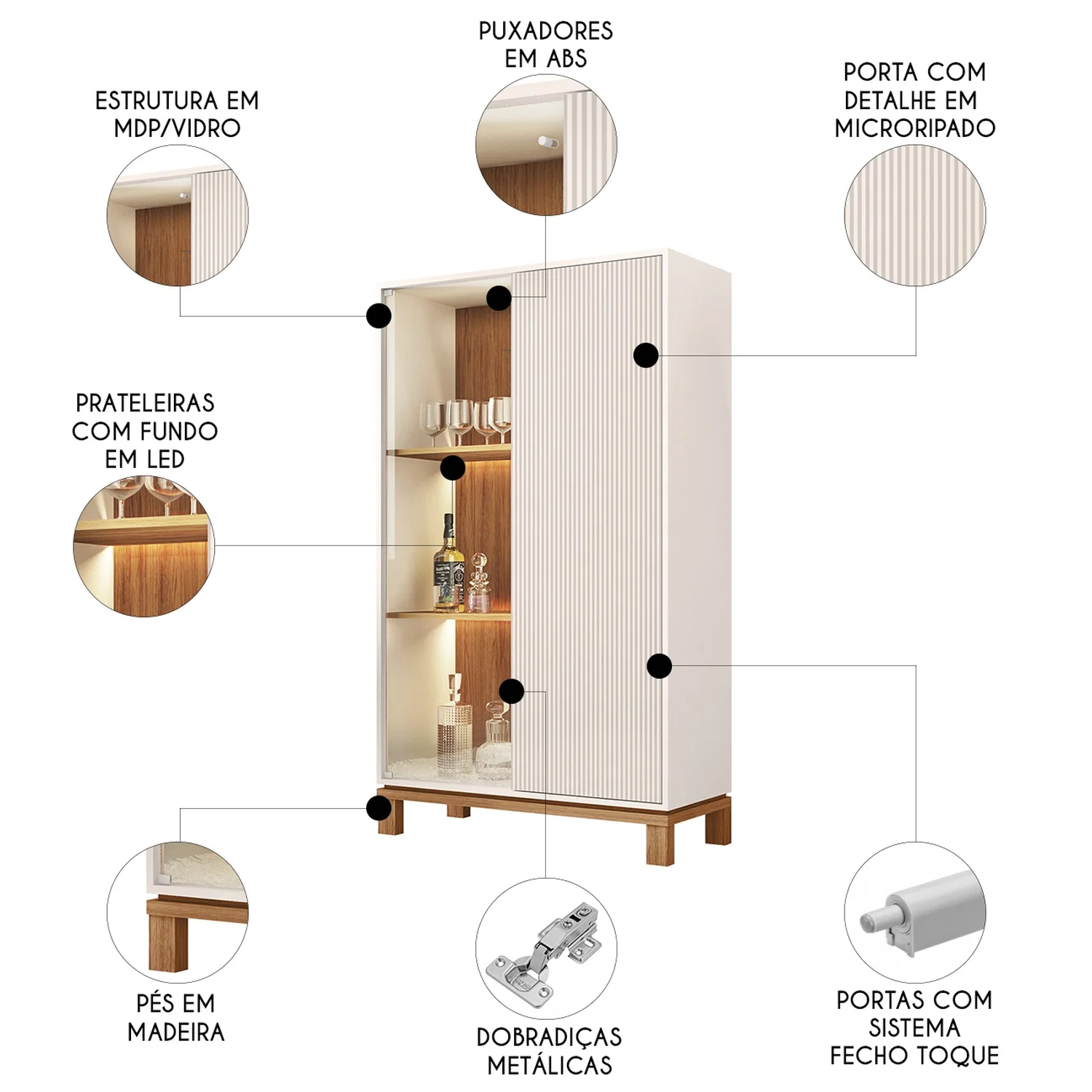 Os pés em cavalete, conferem um ar contemporâneo à peça, criando uma sensação de amplitude e fluidez no ambiente. Além disso, a iluminação interna em LED nas prateleiras, destaca a beleza de cada objeto exibido, seja taças, cristais ou objetos de decoração. Iluminação que não só realça a beleza dos itens, mas também cria uma ambiente aconchegante e sofisticada.