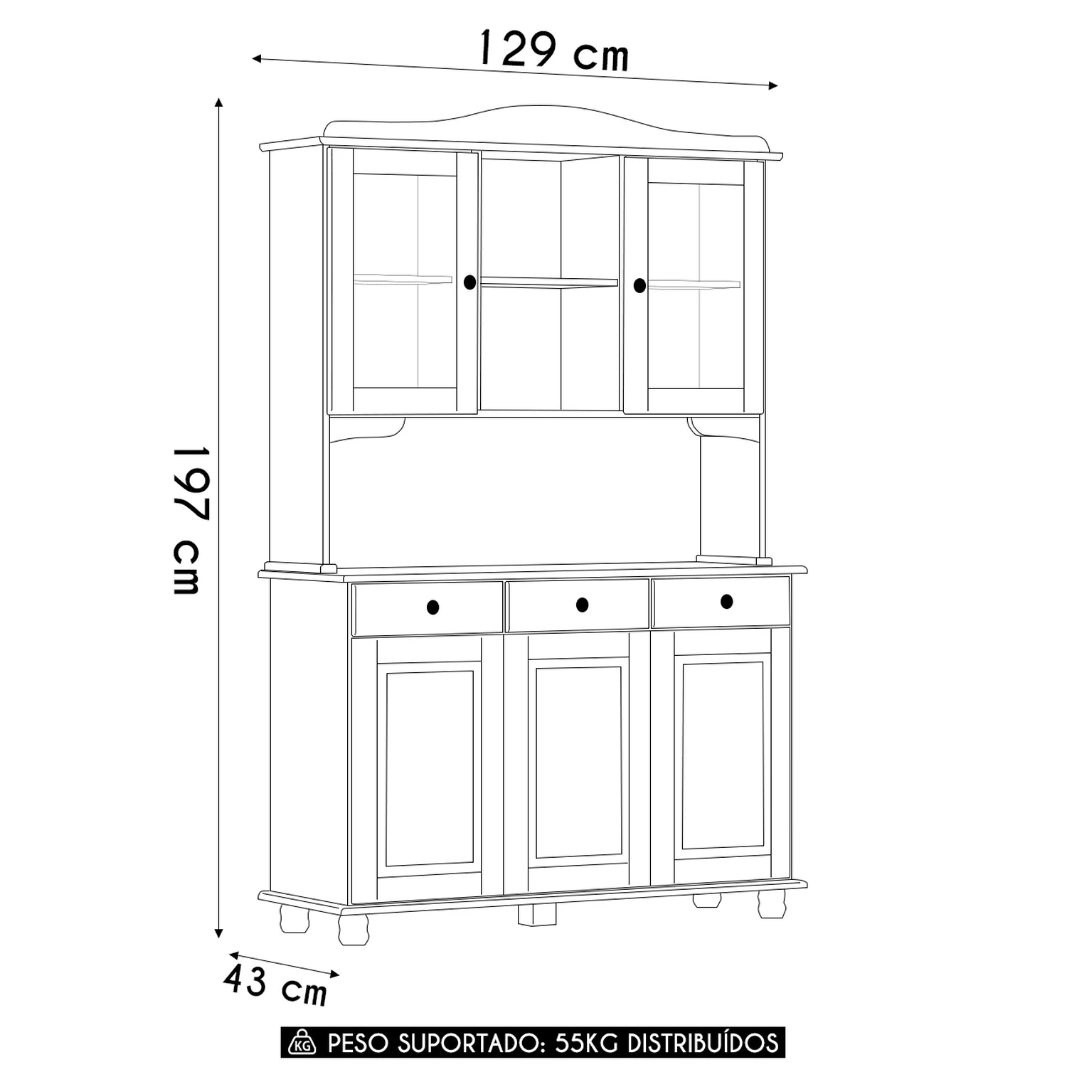 Na parte superior tem uma moldura que agrega um charme ao móvel, além de contar com duas portas de vidro incolor e nichos, perfeitos para expor louças, taças ou itens decorativos. Os detalhes laterais agregam sofisticação a Cristaleira Porta Vidro.