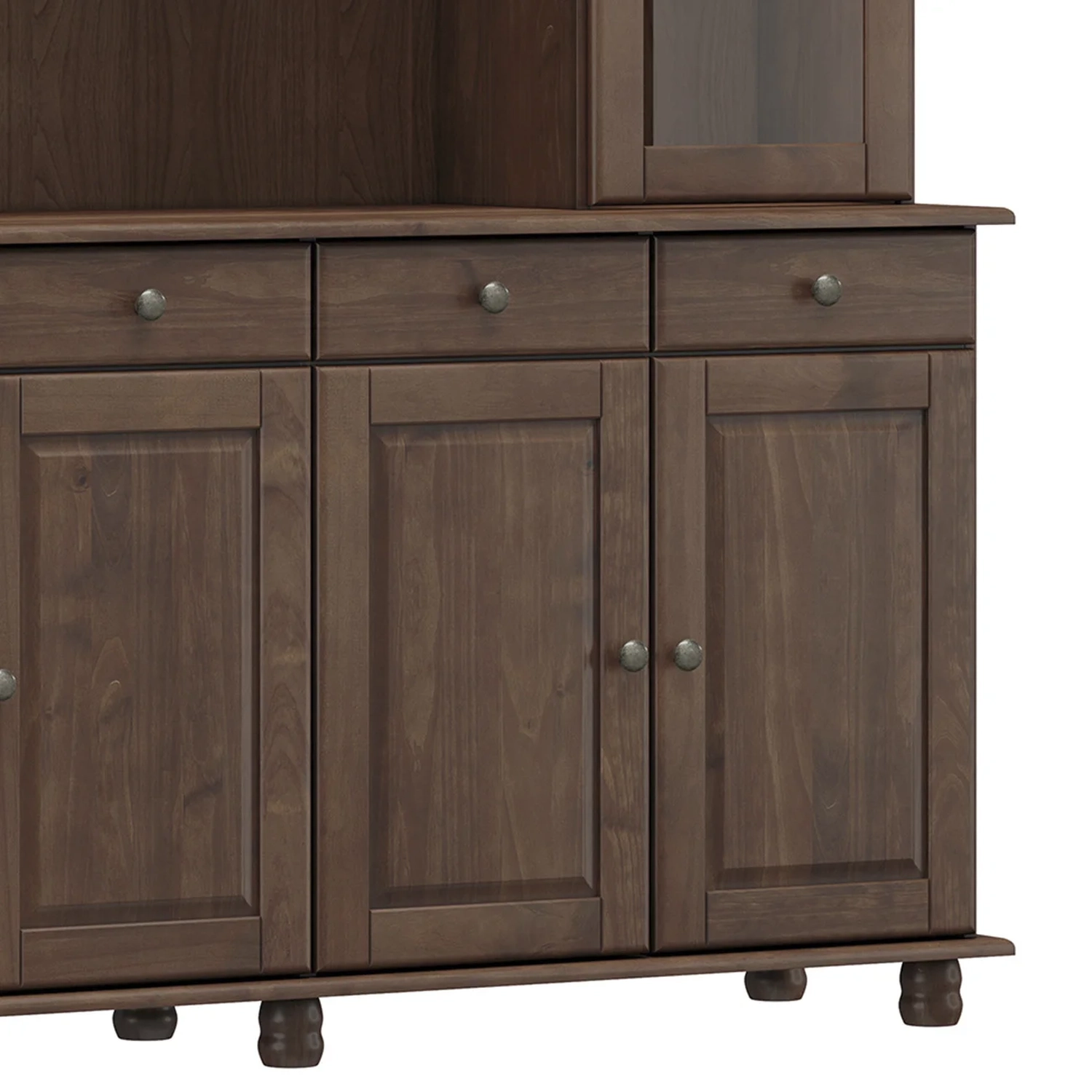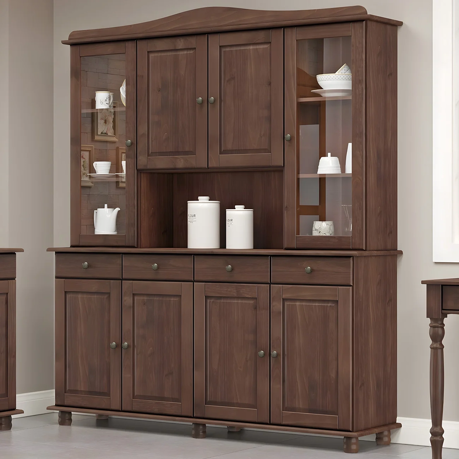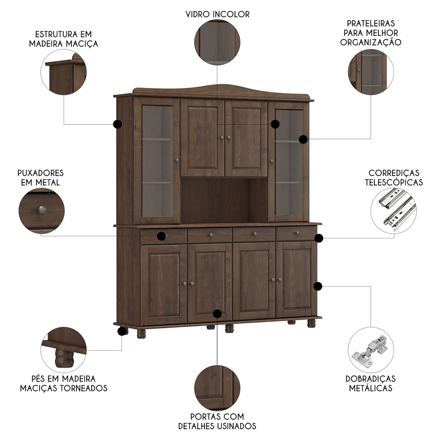 Com gavetas equipadas com corrediças telescópicas e amplas prateleiras, esta Cristaleira de Madeira oferece praticidade e organização para o seu dia a dia. As portas e as gavetas possuem puxadores metálicos que acrescentam sofisticação e charme ao móvel.