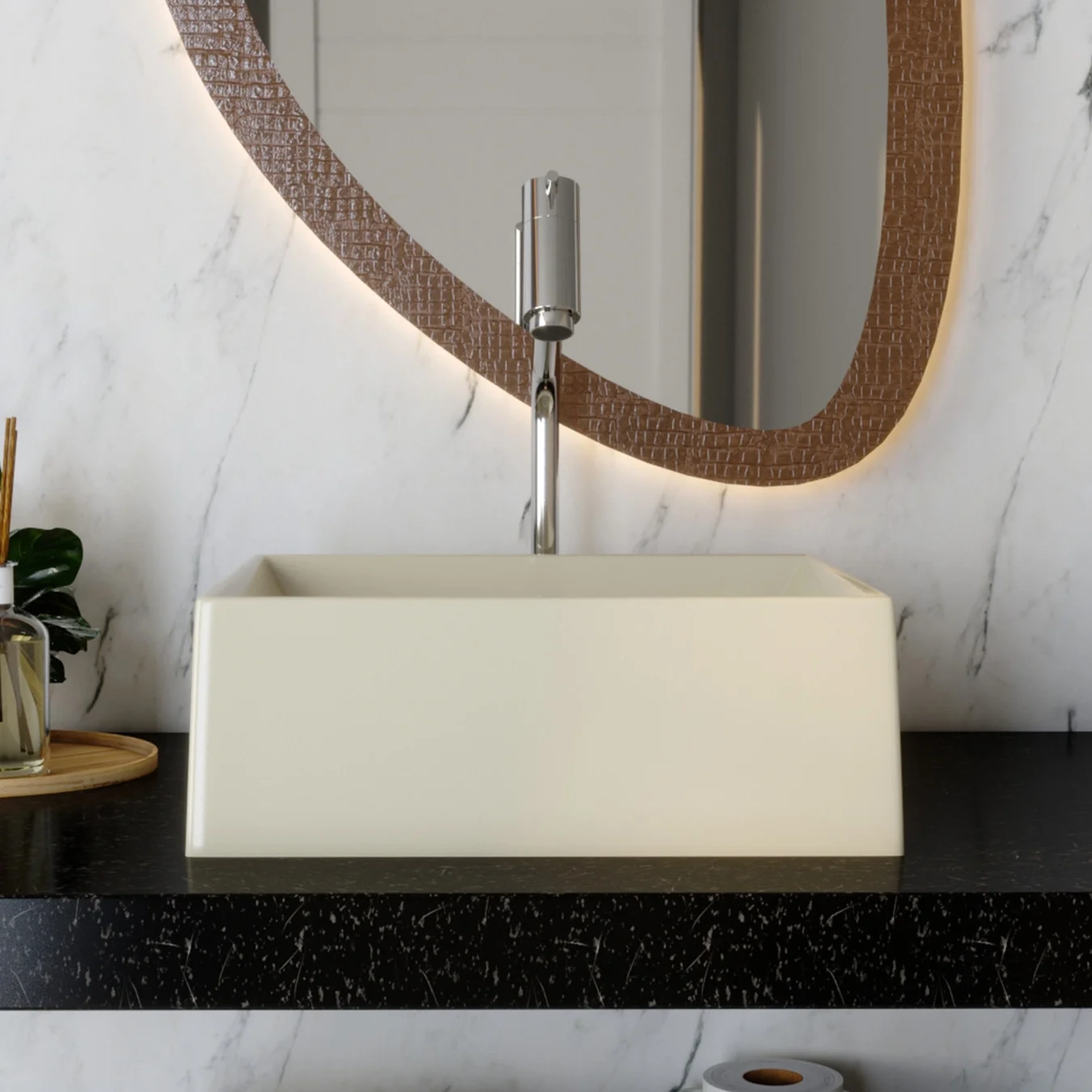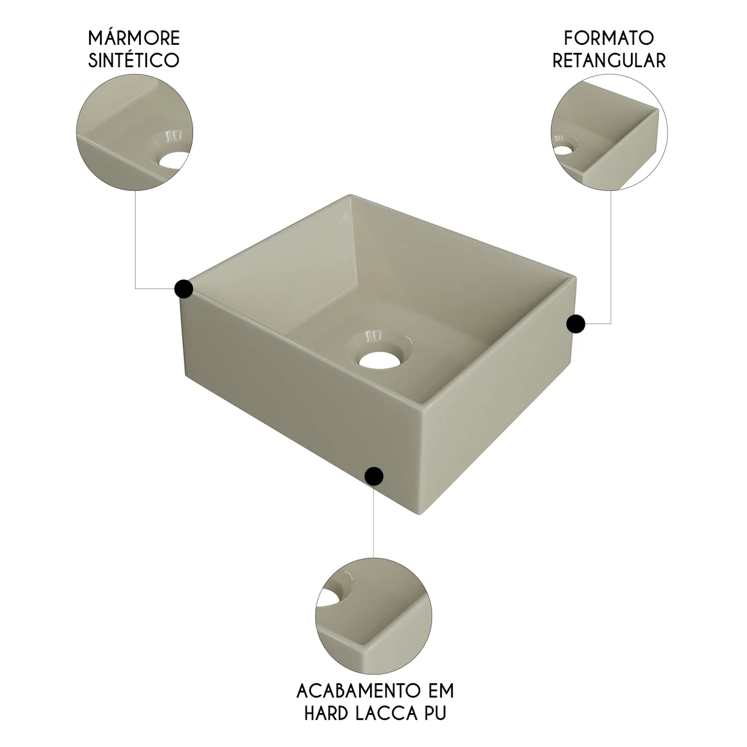 Fabricada em mármore sintético, um material composto por resina poliéster e carga mineral, com camada de Gel Coat e acabamento de pintura poliéster PU, ela é bastante semelhante à louça, porém mais econômica. A Cuba de Apoio combina resistência e durabilidade, além de ter uma instalação super prática. O acabamento em Hard Lacca PU garante brilho e proteção, proporcionando um visual sofisticado e fácil de manter.