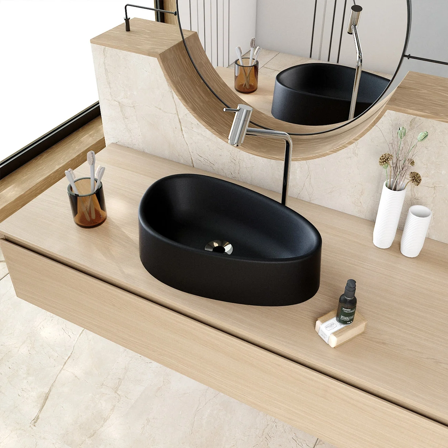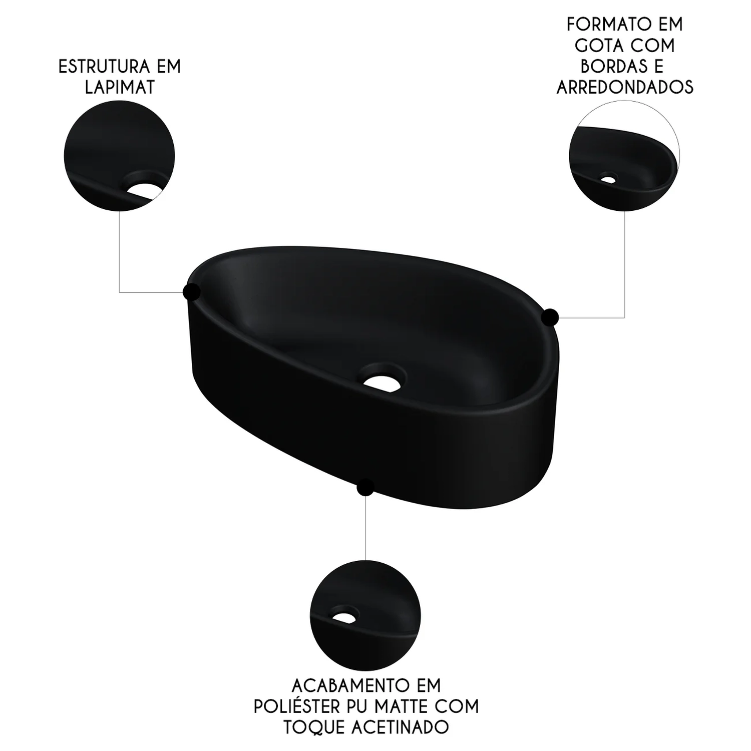 Fabricada em lapimat, um material inovador que combina resina poliéster, cargas minerais selecionadas e aditivos, a Cuba de Apoio se destaca pela resistência e durabilidade excepcionais. A dupla camada de pintura poliéster PU de alta performance, complementada por uma de verniz protetor resultam em um acabamento matte fosco com toque acetinado impecável.