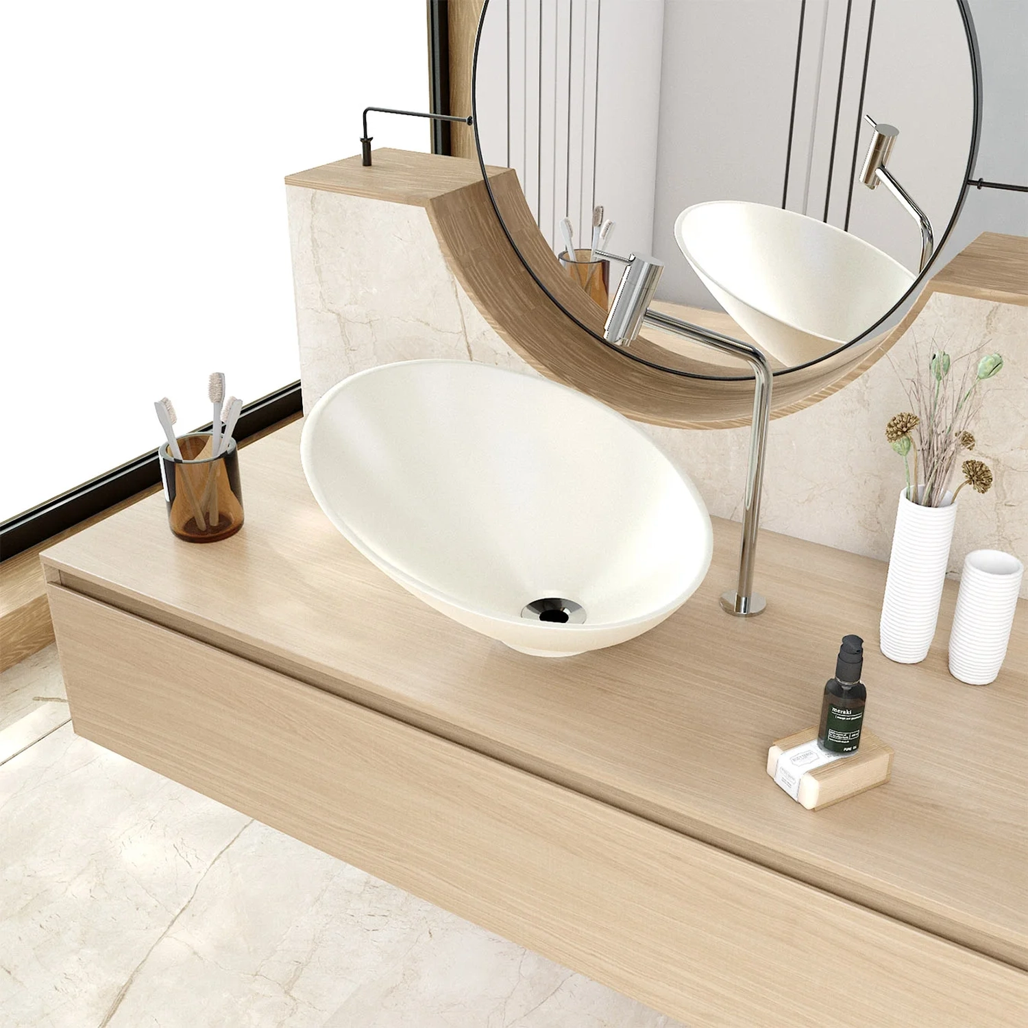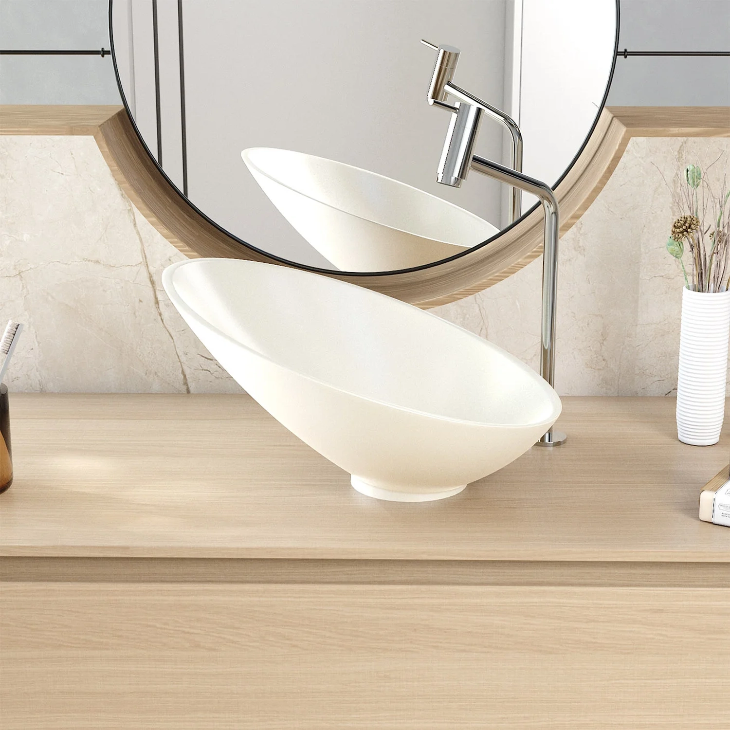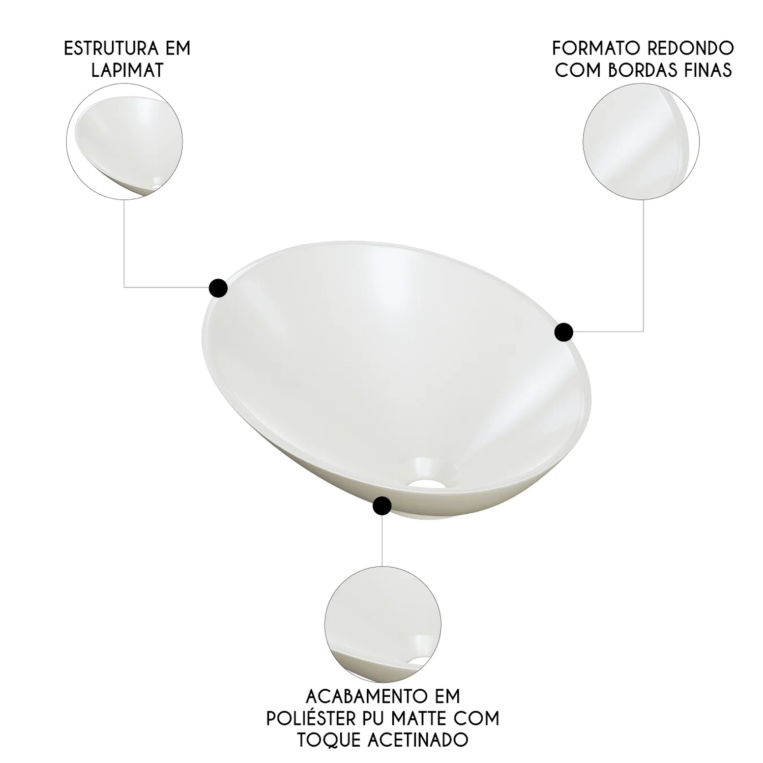 Fabricada em lapimat, um material inovador que combina resina poliéster, cargas minerais selecionadas e aditivos, a Cuba de Apoio se destaca pela resistência e durabilidade excepcionais. A dupla camada de pintura poliéster PU de alta performance, complementada por uma de verniz protetor resultam em um acabamento matte fosco com toque acetinado impecável.
