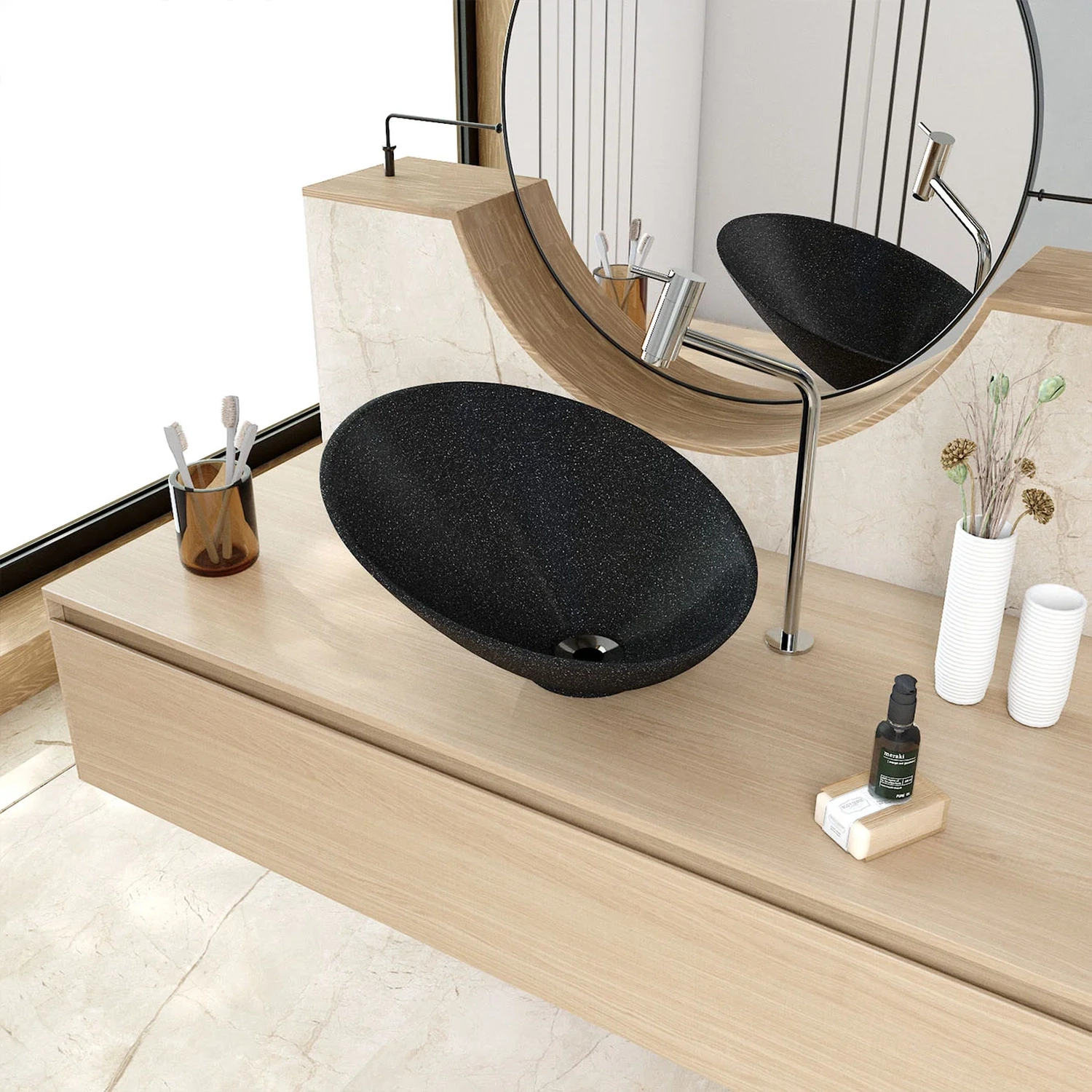 Deixar seu Banheiro moderno, funcional e agradável nunca foi tão simples. A Cuba Pia Para Banheiro Meia Lua 39cm Thaís C08 Preto Granit, da Mpozenato, com seu design exclusivo de formato redondo e bordas finas, é perfeita para adicionar um toque contemporâneo e sofisticado, tornando o ambiente mais acolhedor e elegante.