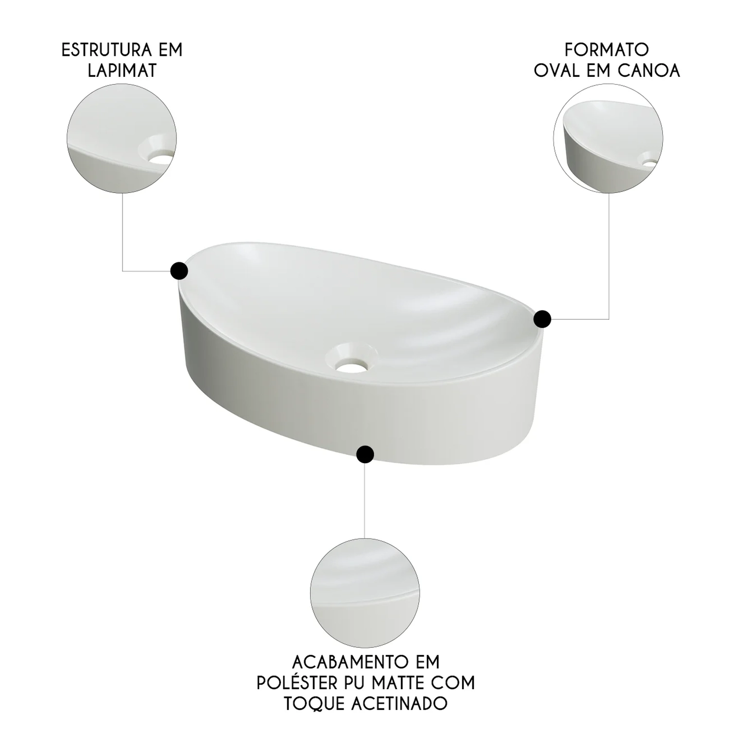 Fabricada em lapimat, um material inovador que combina resina poliéster, cargas minerais selecionadas e aditivos, a Cuba de Apoio se destaca pela resistência e durabilidade excepcionais. A dupla camada de pintura poliéster PU de alta performance, complementada por uma de verniz protetor resultam em um acabamento matte fosco com toque acetinado impecável.