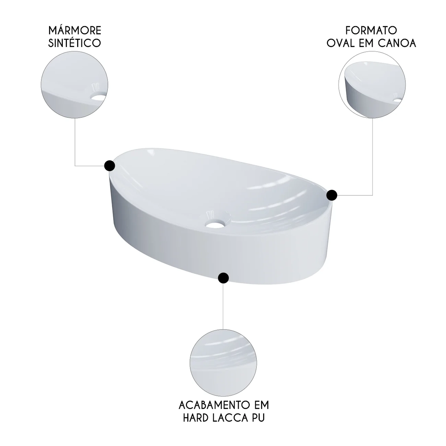 Fabricada em mármore sintético, um material composto por resina poliéster e carga mineral, com camada de Gel Coat e acabamento de pintura poliéster PU, ela é bastante semelhante à louça, porém mais econômica. Essa Cuba de Apoio combina resistência e durabilidade, além de ter uma instalação super prática. O acabamento em Hard Lacca PU garante brilho e proteção, proporcionando um visual sofisticado e fácil de manter.