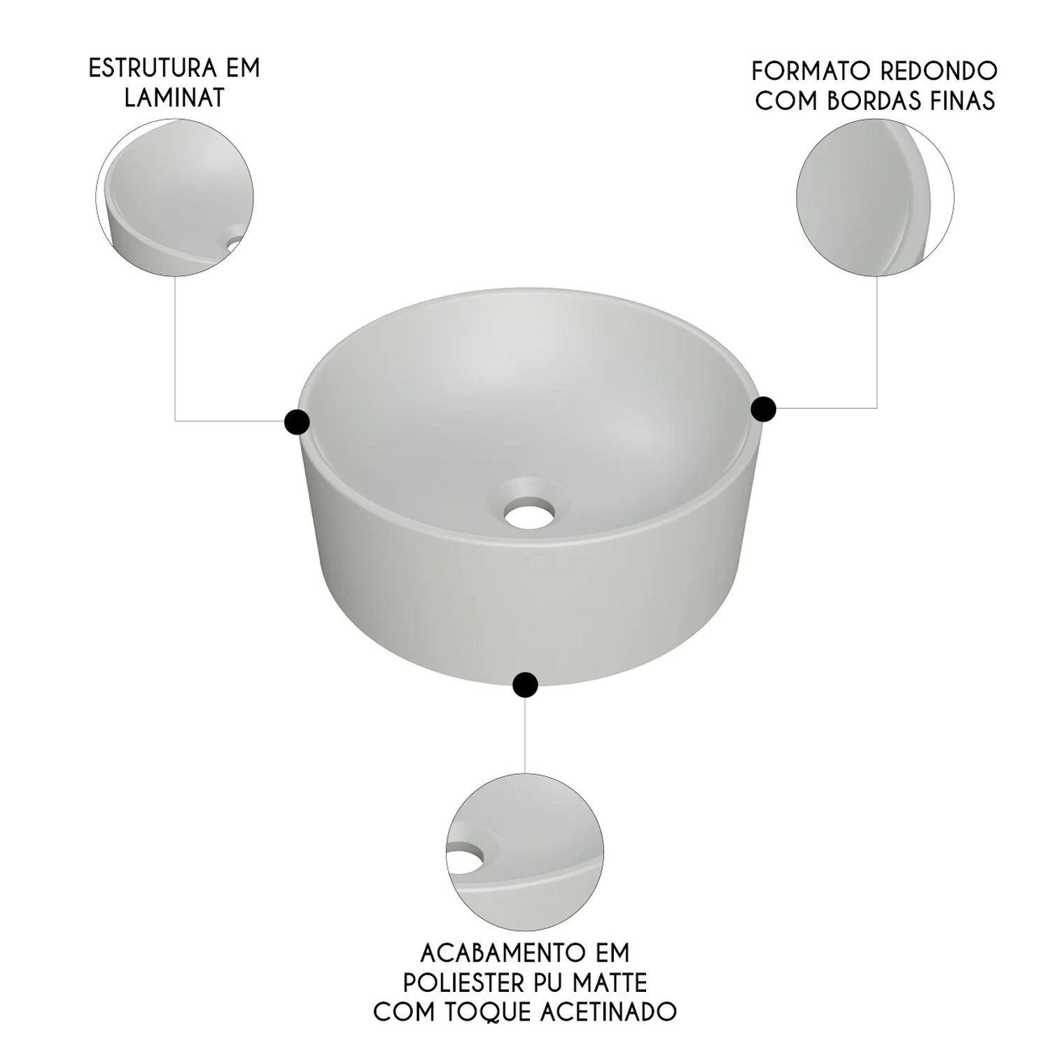 Fabricada em lapimat, um material inovador que combina resina poliéster, cargas minerais selecionadas e aditivos, a Cuba de Apoio se destaca pela resistência e durabilidade excepcionais. A dupla camada de pintura poliéster PU de alta performance, complementada por uma de verniz protetor resultam em um acabamento matte fosco com toque acetinado impecável.