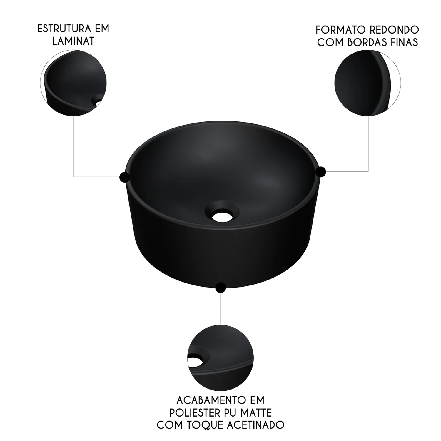 Fabricada em lapimat, um material inovador que combina resina poliéster, cargas minerais selecionadas e aditivos, a Cuba de Apoio se destaca pela resistência e durabilidade excepcionais. A dupla camada de pintura poliéster PU de alta performance, complementada por uma de verniz protetor resultam em um acabamento matte fosco com toque acetinado impecável.