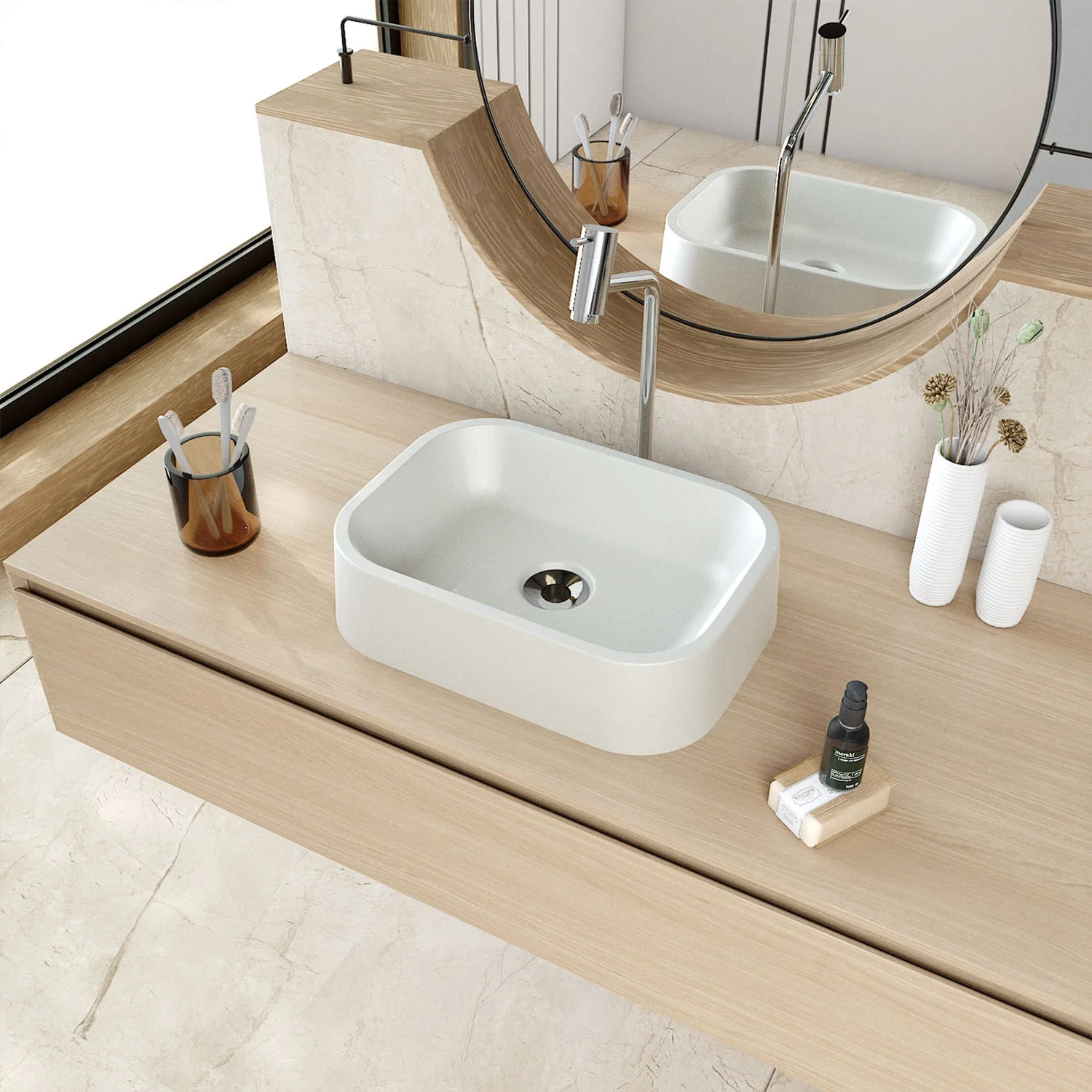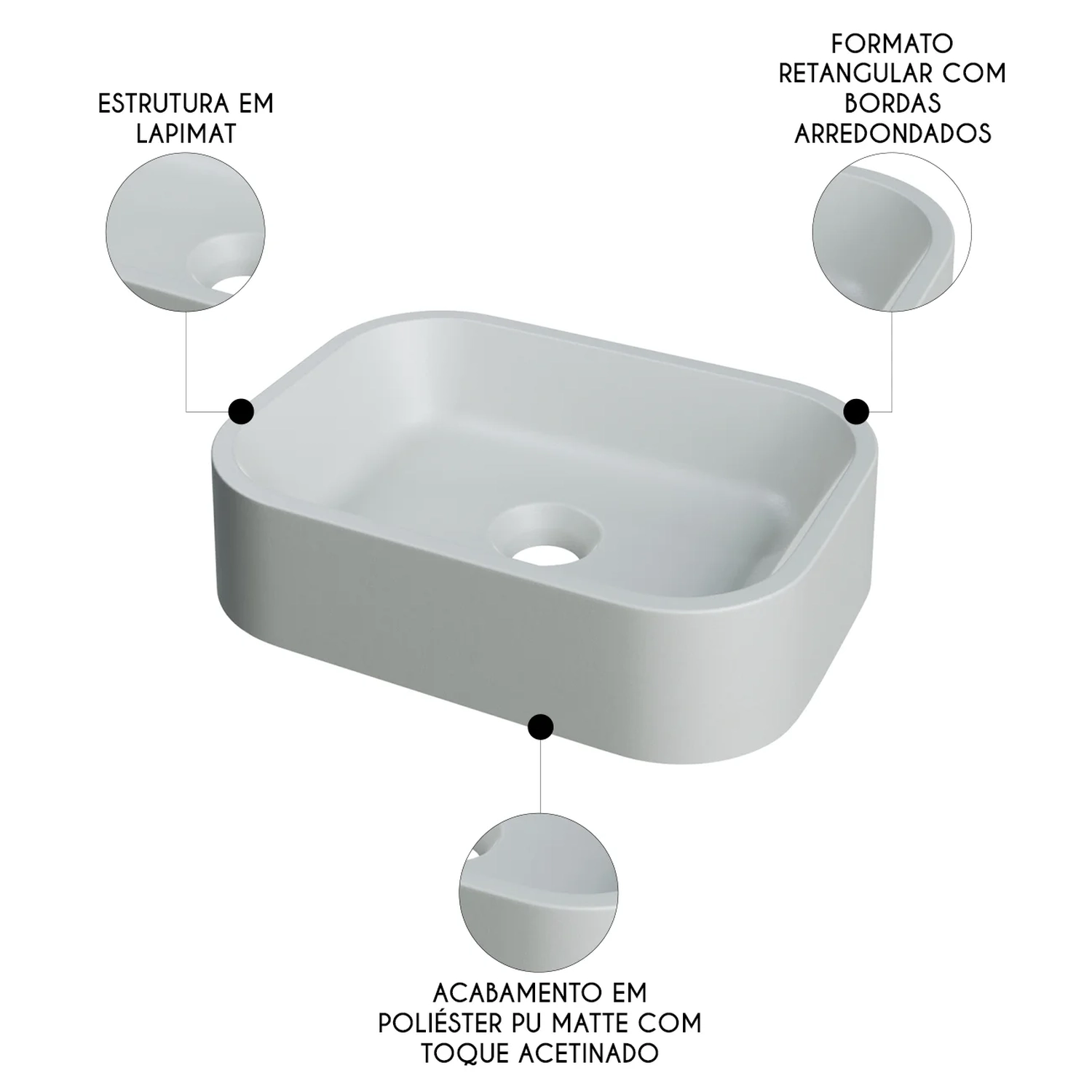 Fabricada em lapimat, um material inovador que combina resina poliéster, cargas minerais selecionadas e aditivos, a Cuba de Apoio se destaca pela resistência e durabilidade excepcionais. A dupla camada de pintura poliéster PU de alta performance, complementada por uma de verniz protetor resultam em um acabamento matte fosco com toque acetinado impecável.