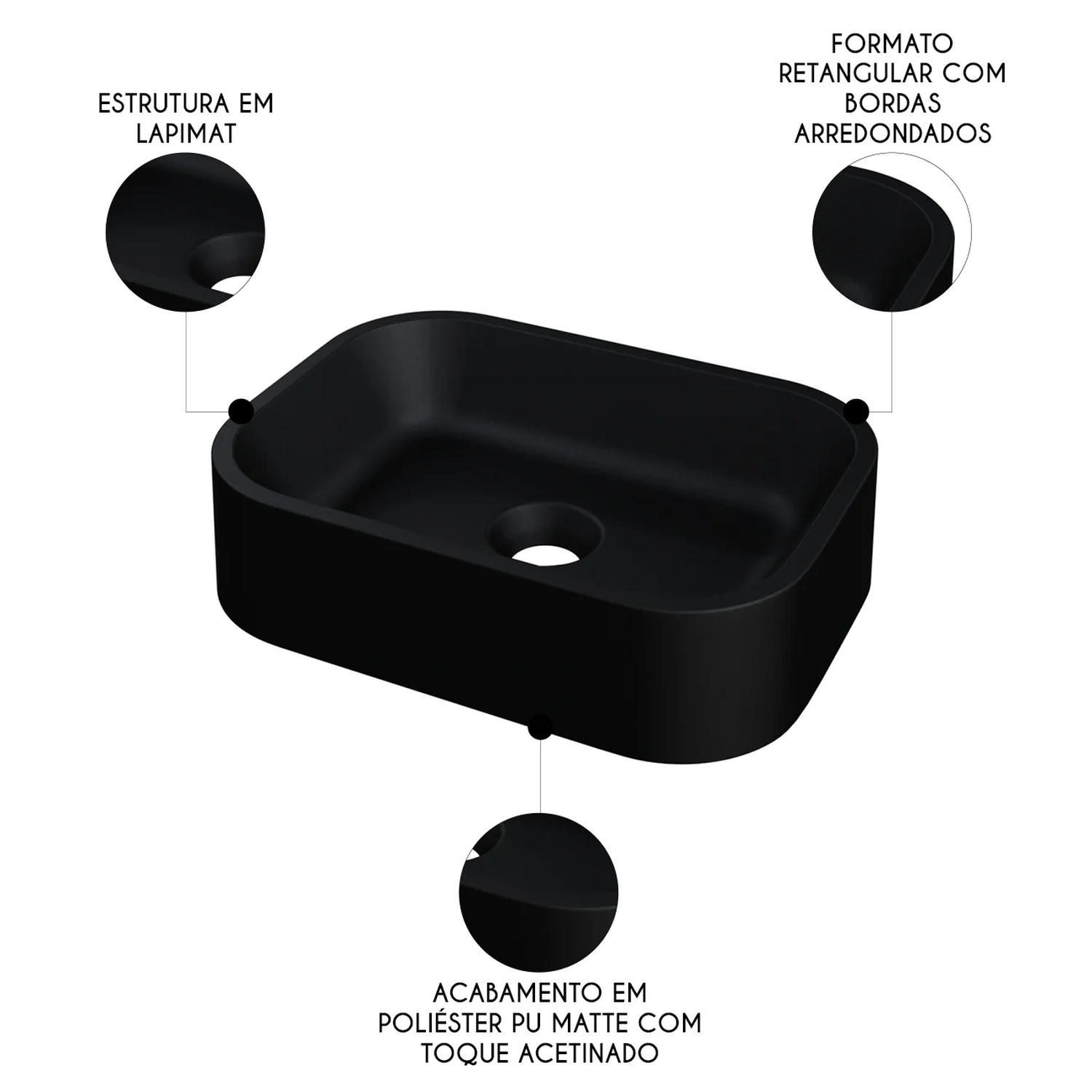 Fabricada em lapimat, um material inovador que combina resina poliéster, cargas minerais selecionadas e aditivos, a Cuba de Apoio se destaca pela resistência e durabilidade excepcionais. A dupla camada de pintura poliéster PU de alta performance, complementada por uma de verniz protetor resultam em um acabamento matte fosco com toque acetinado impecável.
