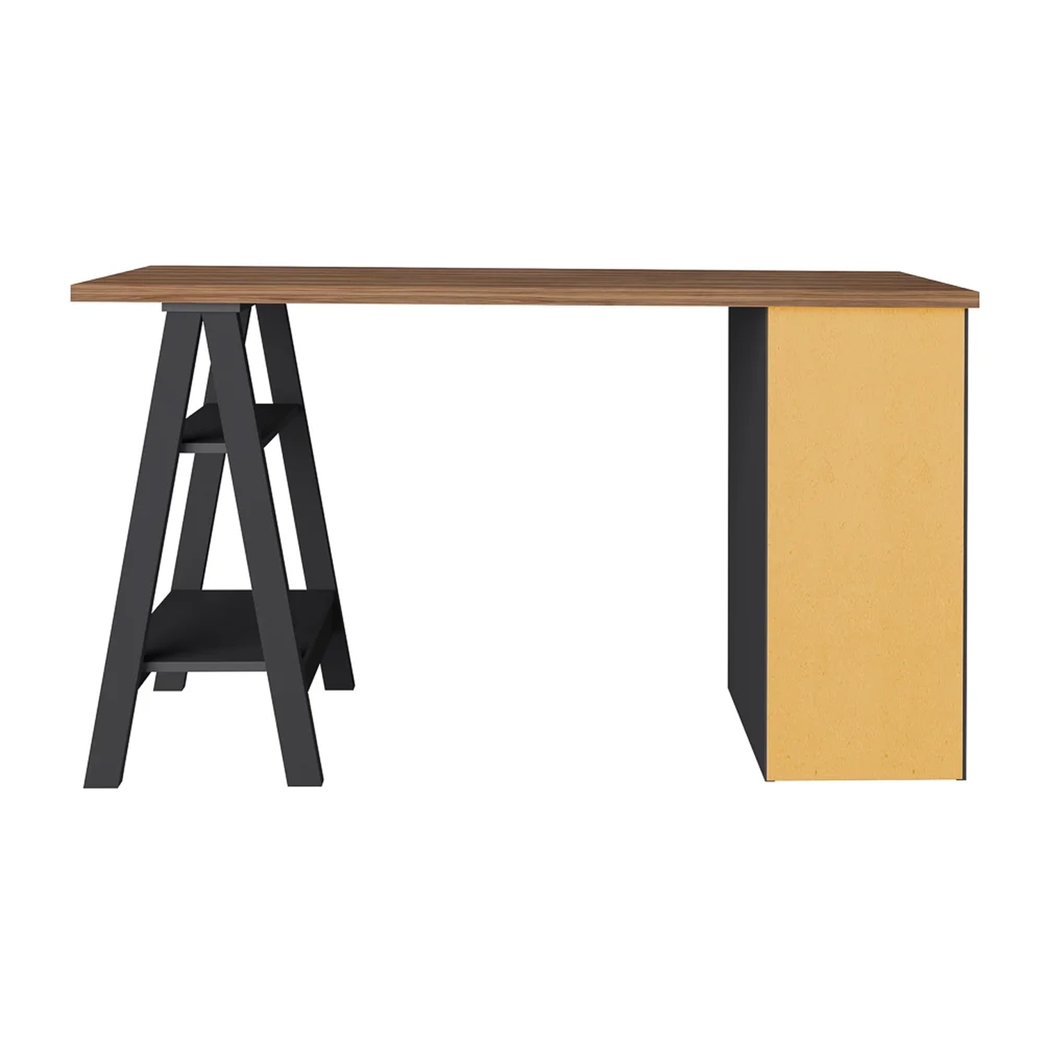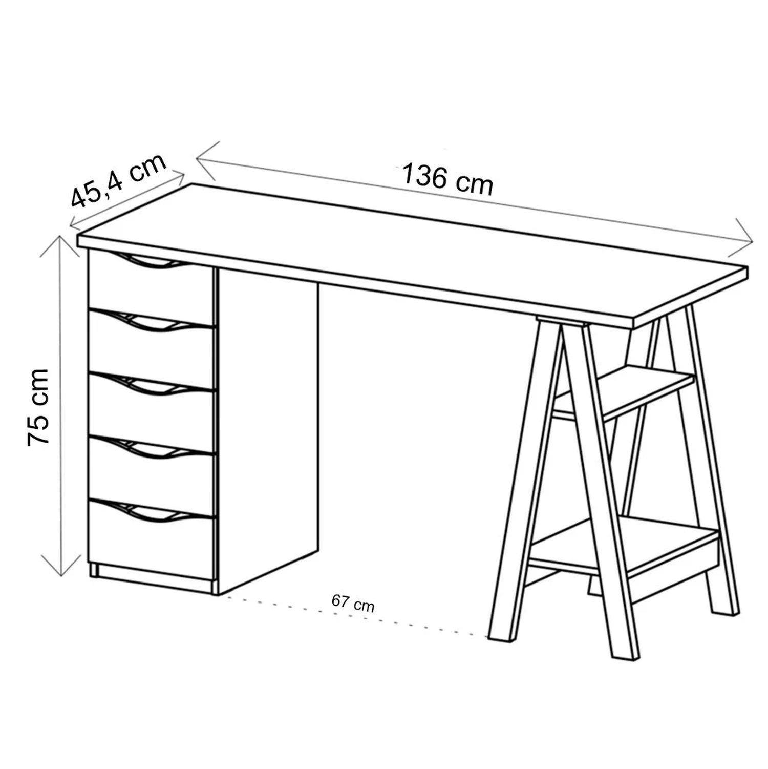 Ah, outro detalhe é que você pode escolher em qual lado vai instalar o gaveteiro, proporcionando mais versatilidade e adequação ao ambiente. Além disso, esse móvel é bastante resistente, sendo o tampo fabricado em MDP 25mm de espessura, fita de borda PVC e com revestimento em BP para proteger o móvel de possíveis arranhões. Já o gaveteiro, os pés cavalete e as prateleiras são em MDP 15mm de espessura e também com fita de borda PVC.